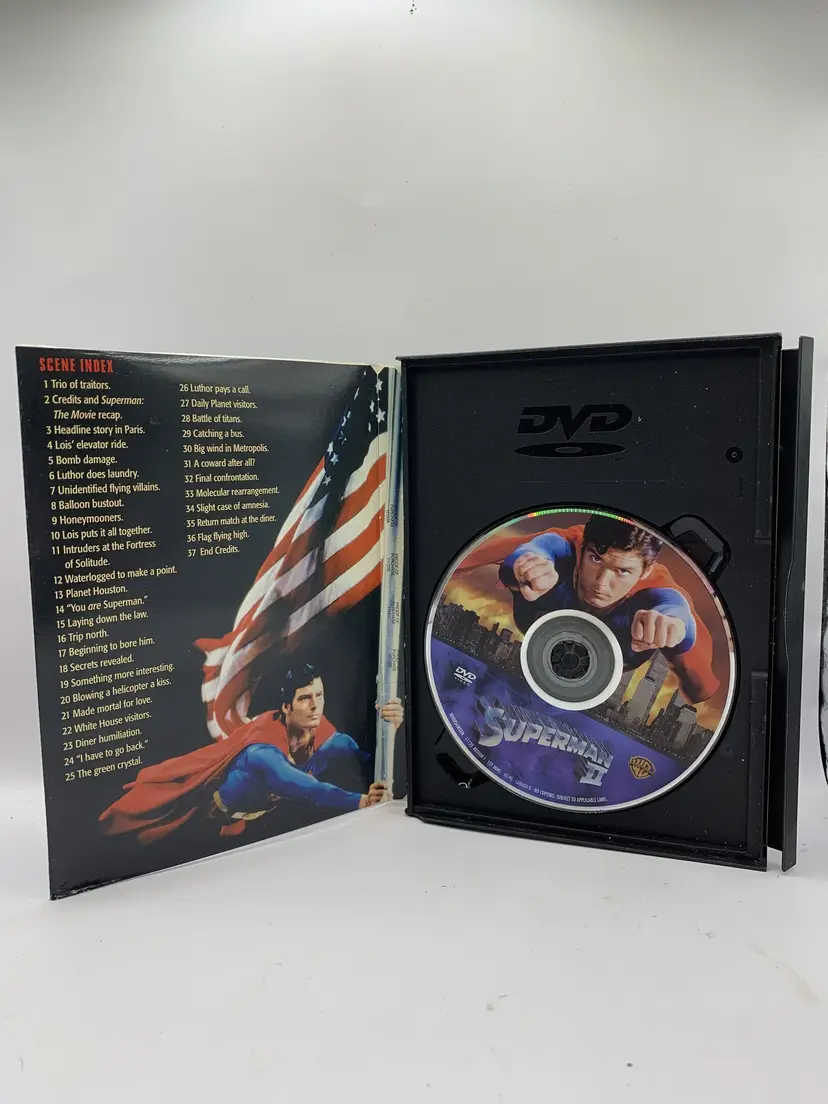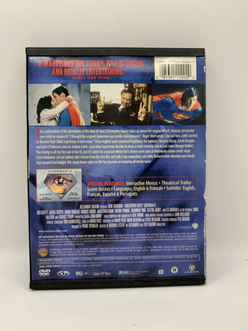 Superman agrees to sacrifice his powers to start a relationship with Lois Lane unaware that three Kryptonian criminals he inadvertently released are conquering Earth. Movie Genre: Action Adventure Sci-Fi Actors: Gene Hackman Christopher Reeve Margot Kidder Writers: Jerry Siegel Joe Shuster Mario Puzo Running Time: 127 minutes Release Date: 19 Jun 1981 Studio & Production Company: Dovemead Films Format: DVD Region Code: Region 1 - Canada the United States and U.S. territories. Video Format: NTSC.Size: Unisex OS