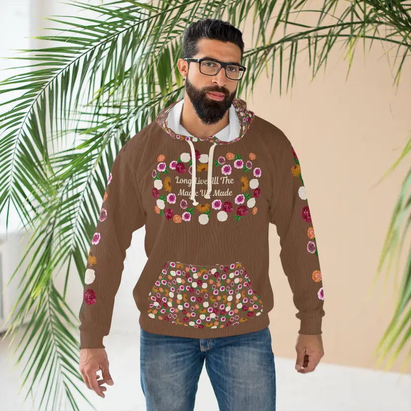 This Pullover Hoodie is made for warmth and comfort. It features a large front pocket, a hood with a drawstring, and is custom cut and sewn.