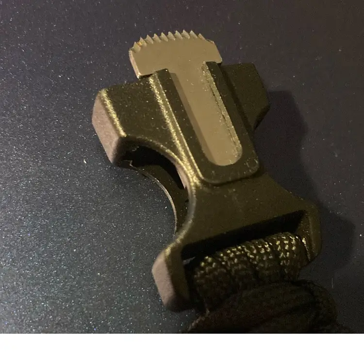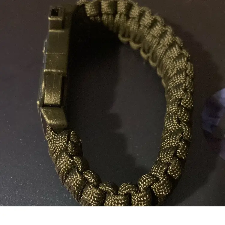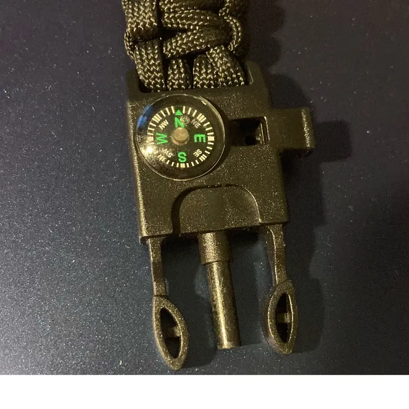 Survival bracelet made a black heavy duty cord fastened with plastic clip that features a whistle, a compass and a flint with striker.