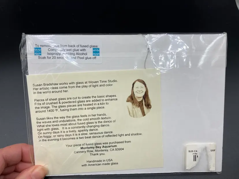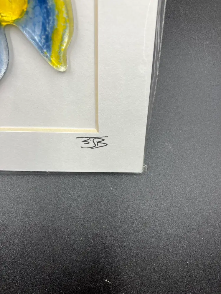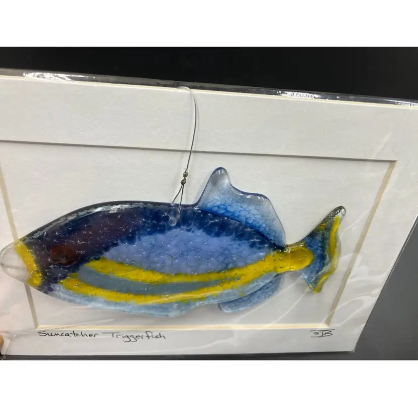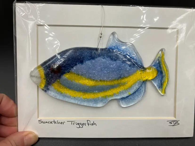 Fish measures 6” x 3.25”. Mat measures 5.5” x 7.5”. Condition is New in original packaging! Susan Bradshaw is a fused glass artist at Woven Time studio in Mossyrock, WA.