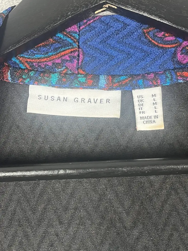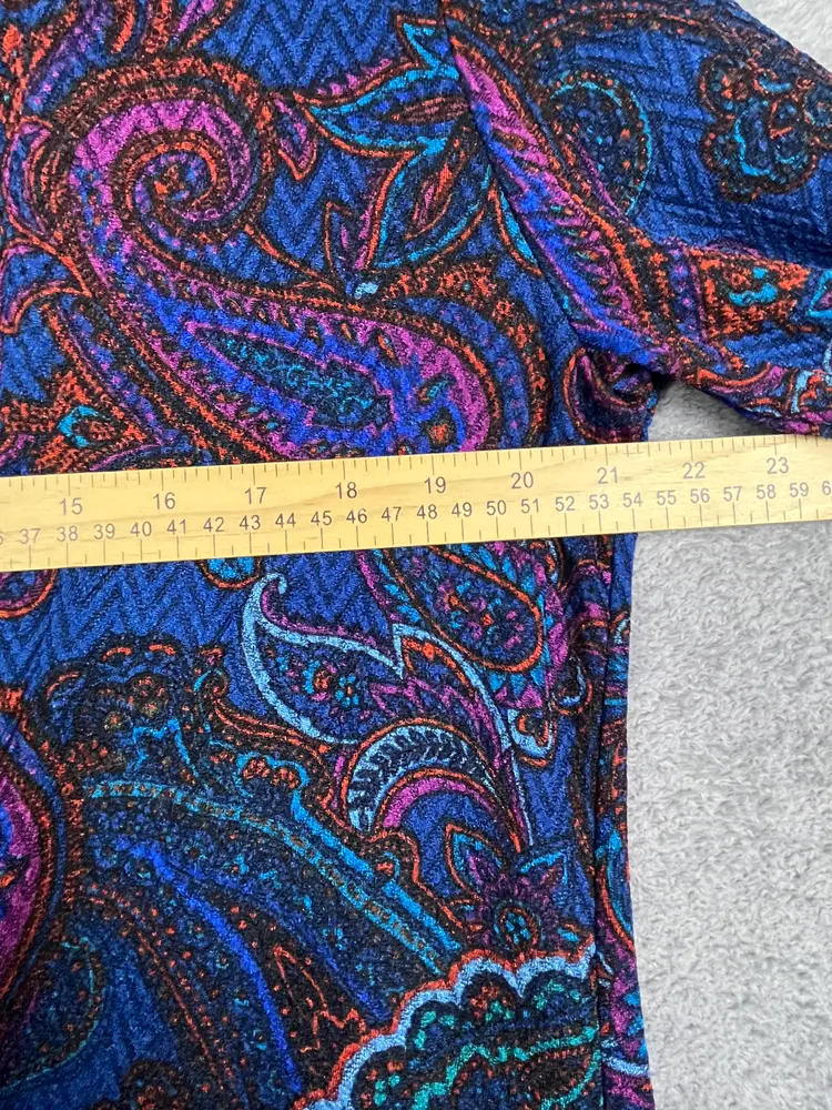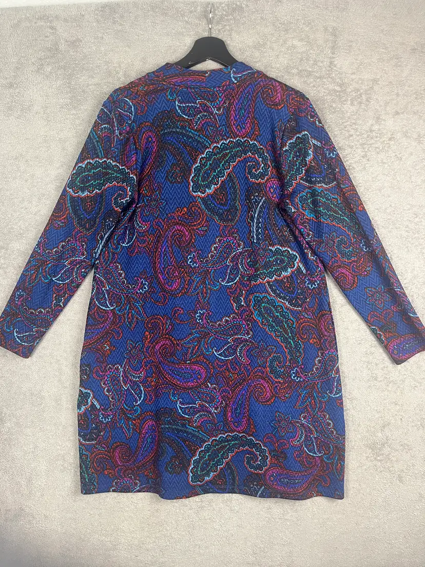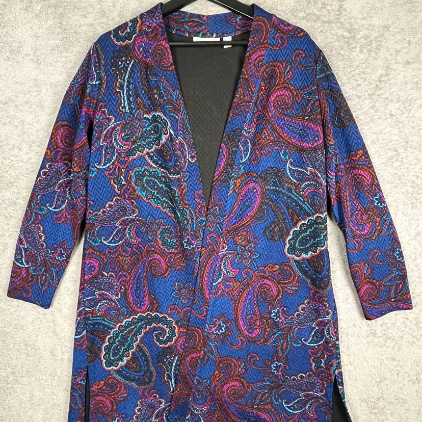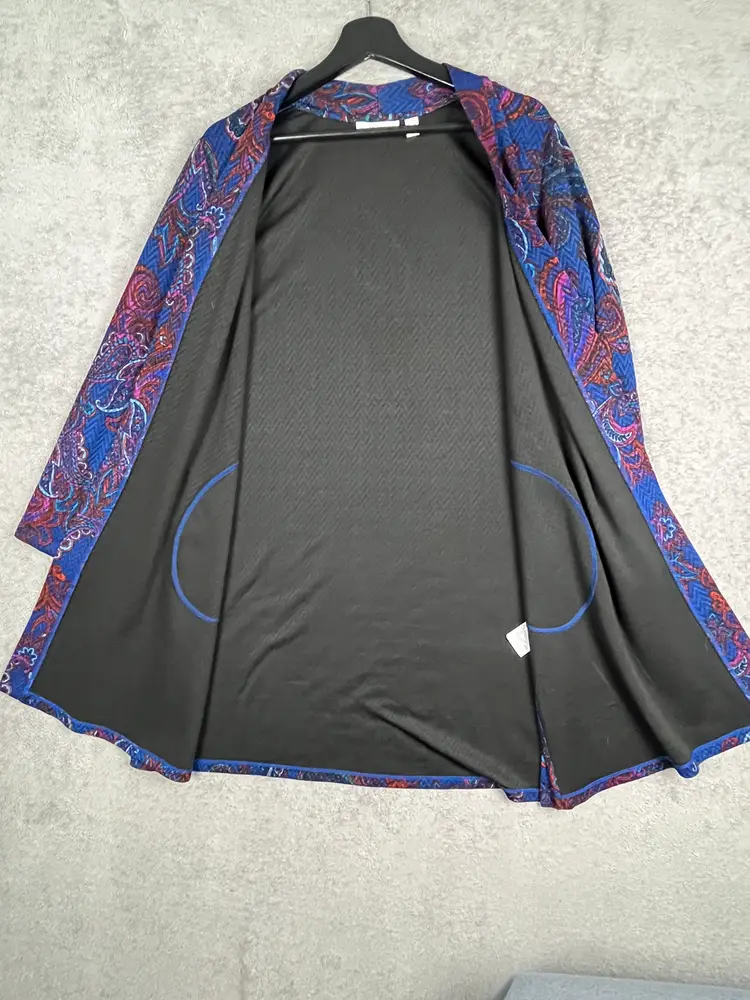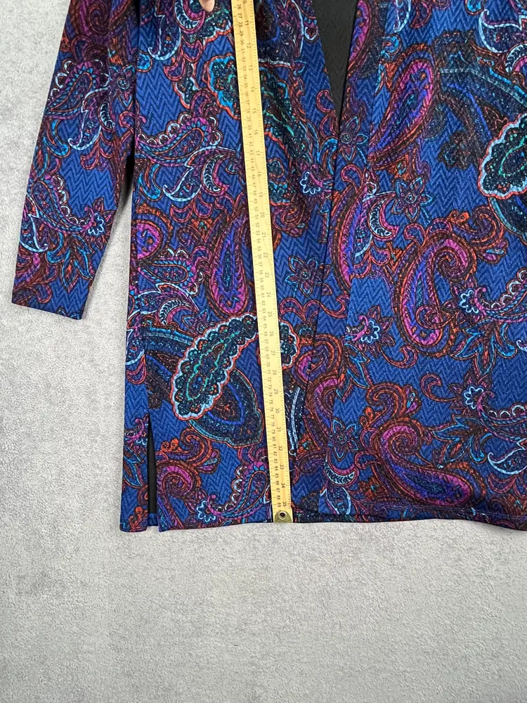 Details Size: Womens M Color: Blue Multicolor Fabric: 95% polyester, 5% spandex Style: Long Cardigan, Paisley, Artsy, Bold, Classic Original Retail: Approximately $65 to $79, depending on season Condition: Excellent preowned condition. See pictures for measurements.