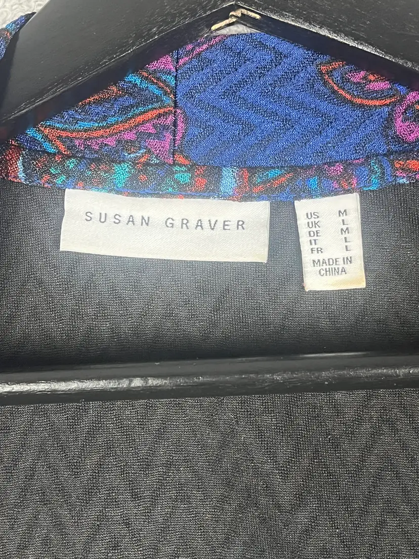 Beautiful Susan Graver open-front long cardigan featuring a vibrant multicolor paisley pattern with rich jewel tones. The mid-weight stretch knit offers a soft, comfortable feel with excellent drape, while the open front and side slits create easy movement. This is a standout piece that adds instant color, artistry, and personality to any outfit.