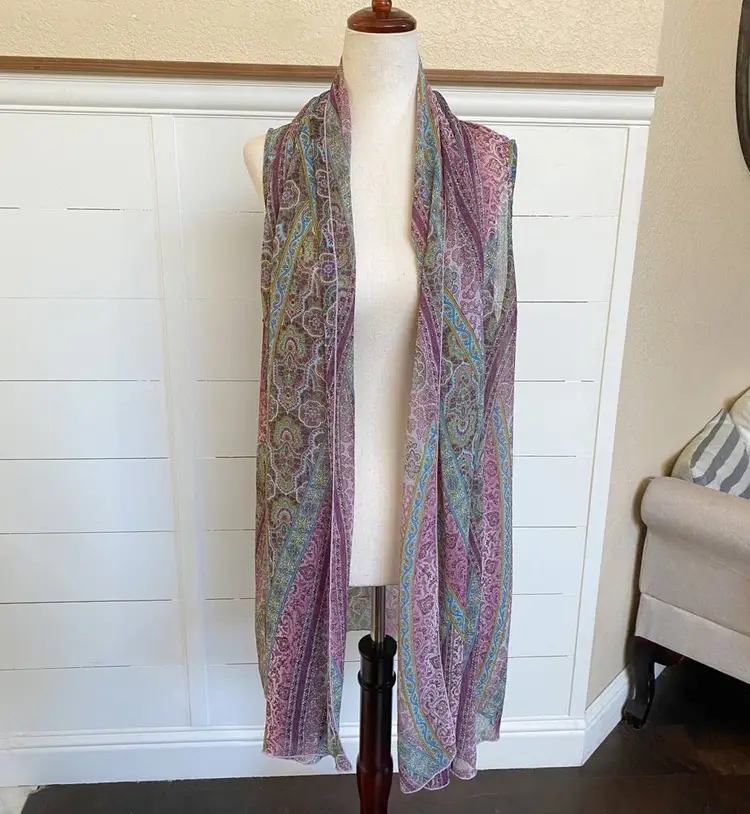 In excellent condition! Beautiful feminine paisley print open chiffon sheer vest from QVC’s Susan Graver’s clothing line. The perfect piece to add color to any outfit and layer with! This sheer classy long vest can instantly dress up any outfit. All over floral paisley print in feminine shades of pink, purple, blue and green. Features a shawl collar and open front silhouette.