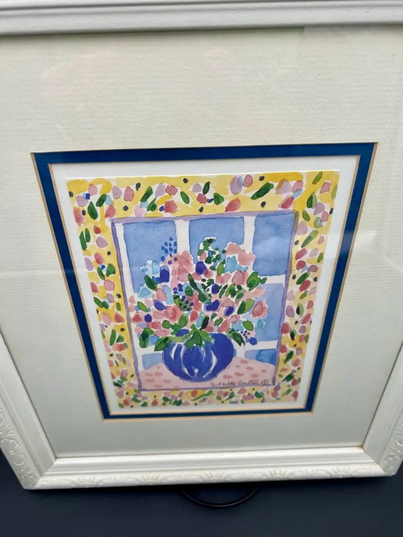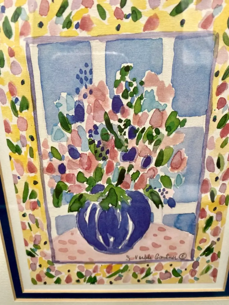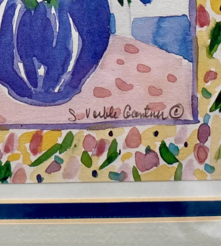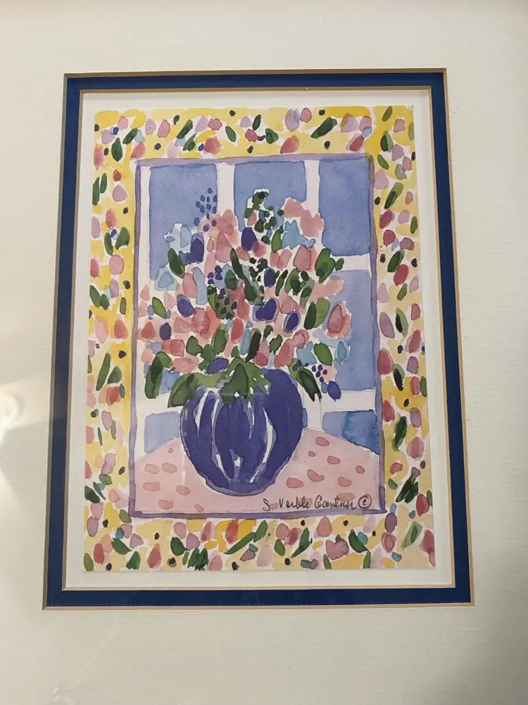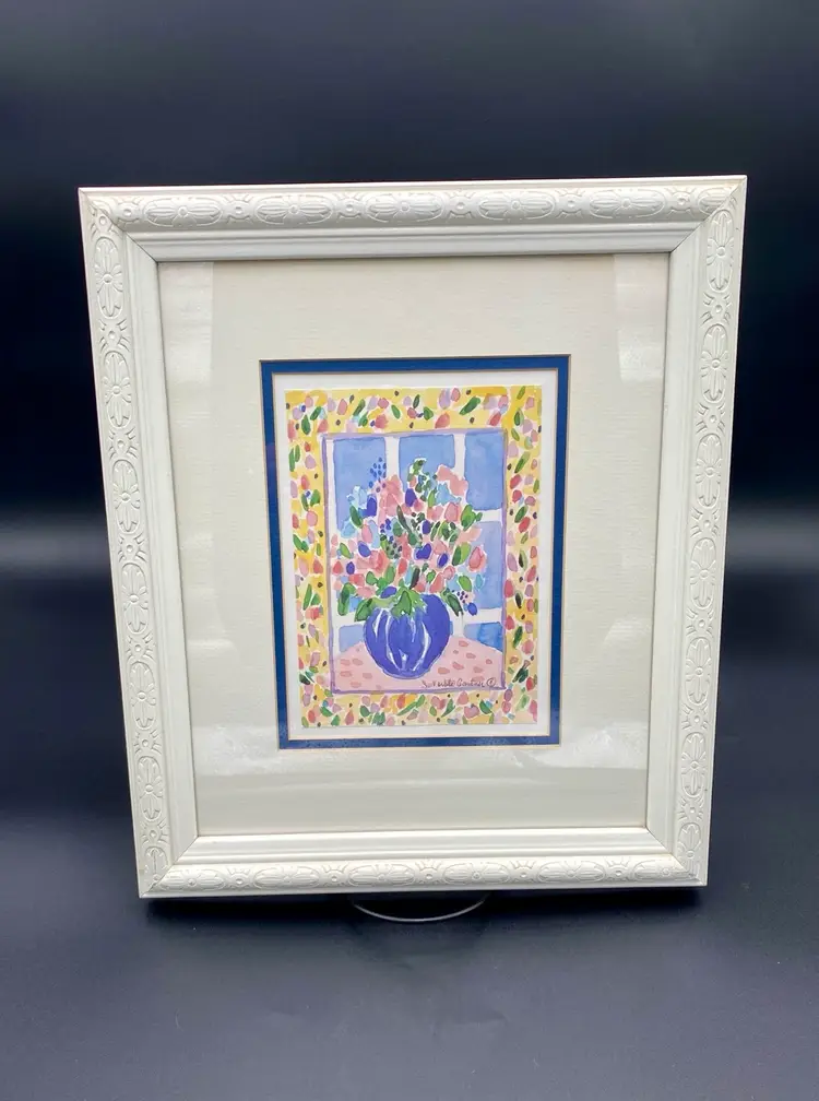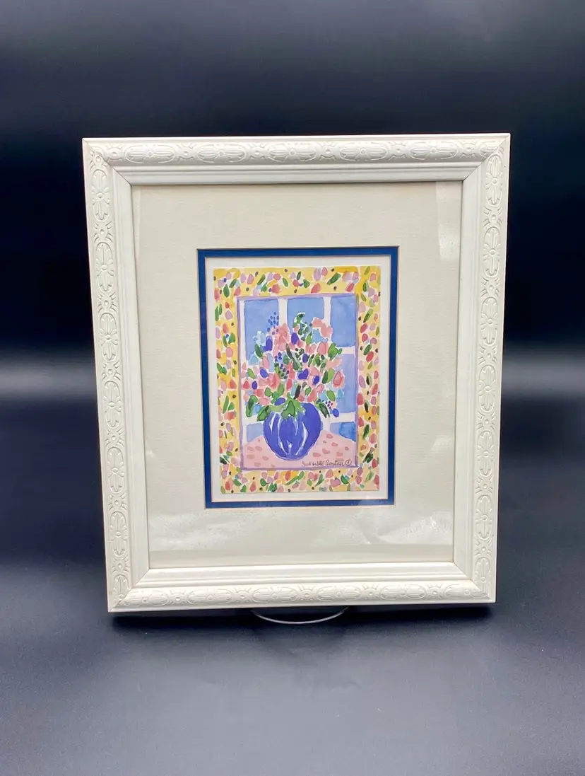 This beautiful watercolor painting by Susan Verble Gantner is a lovely piece of artwork that will add a touch of impressionism to any room. The painting features a purple vase and flowers, and is signed by the artist. The piece measures 7 inches in height and 5 inches in width, is double-matted and professionally framed. (Frame dimensions are 14.2 inches x 12 inches.)