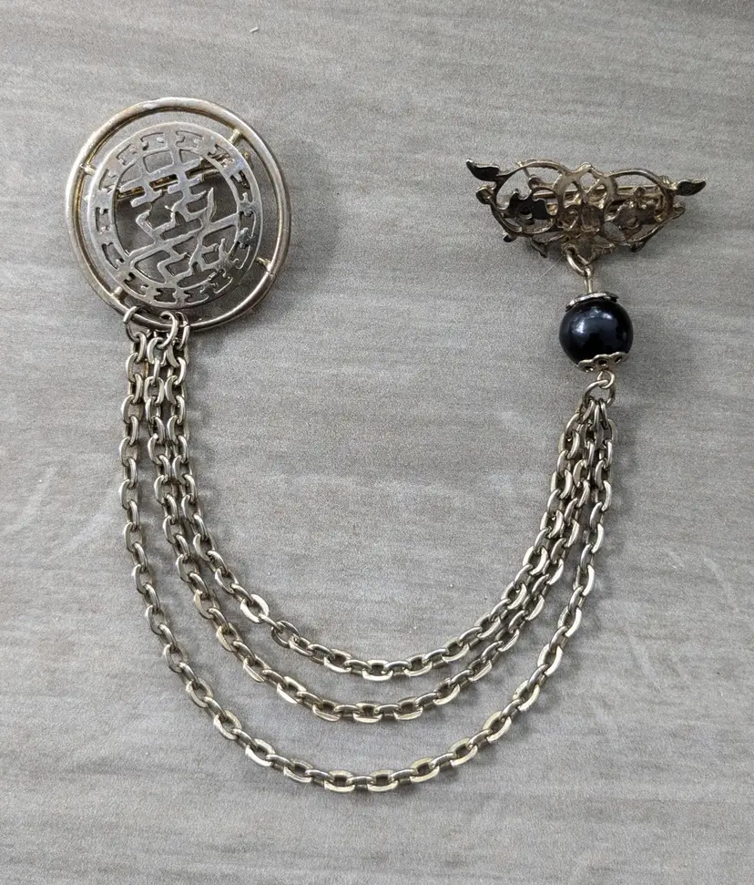A classic swag brooch in pale gold with a black bead. The two brooches are connected with three chains.