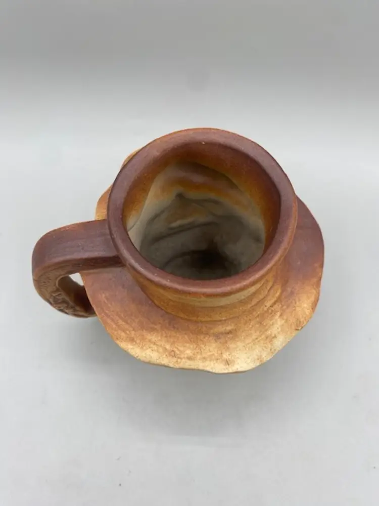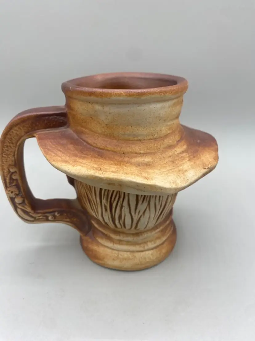 The Swagman Pottery Australia Face 5" Mug is a handmade, round, brown clay ceramic mug featuring folk art patterns. Made in Australia by the Swagman Pottery brand, this decorative mug is suitable for all occasions and stands at 5 inches tall. This original piece is crafted using pottery production techniques, adding a touch of uniqueness to your drinkware collection. Perfect for adding a rustic charm to your kitchen or dining area, this mug is sure to be a conversation starter at any meal.