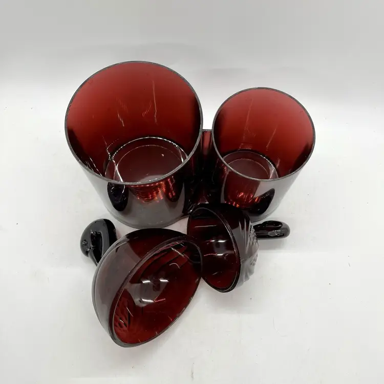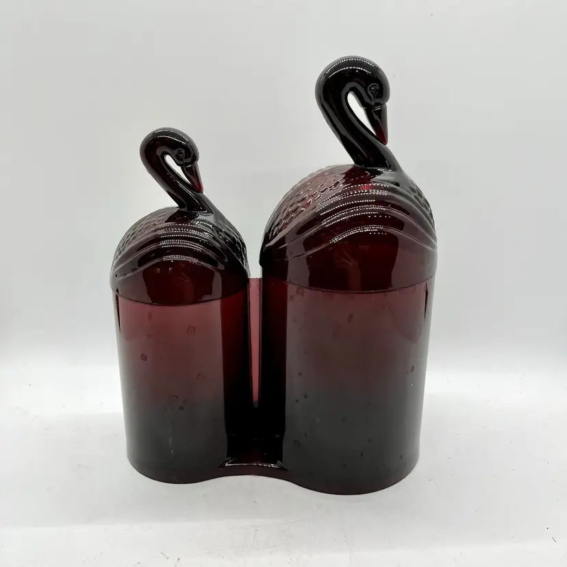 This is a deep amethyst purple set of vanity jars. Features two swan lids and two different sizes. No damages, they measure about 7.5" and 6.5" tall with lids on.