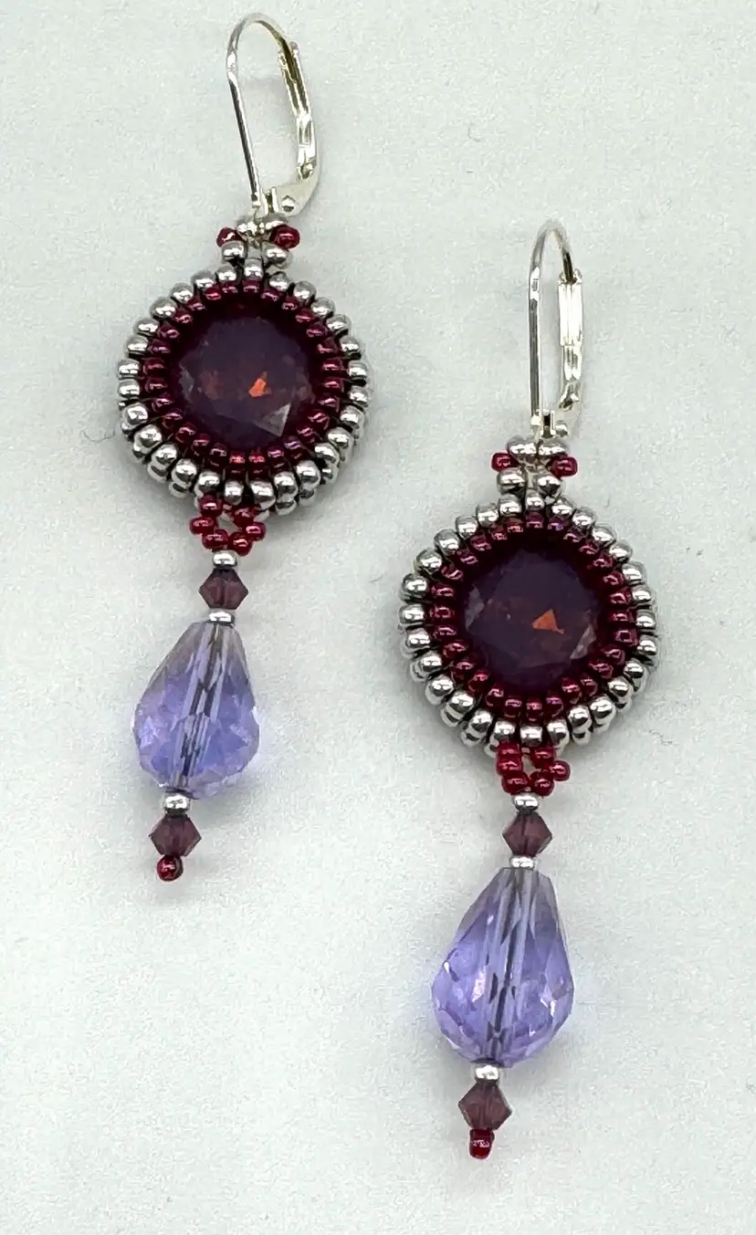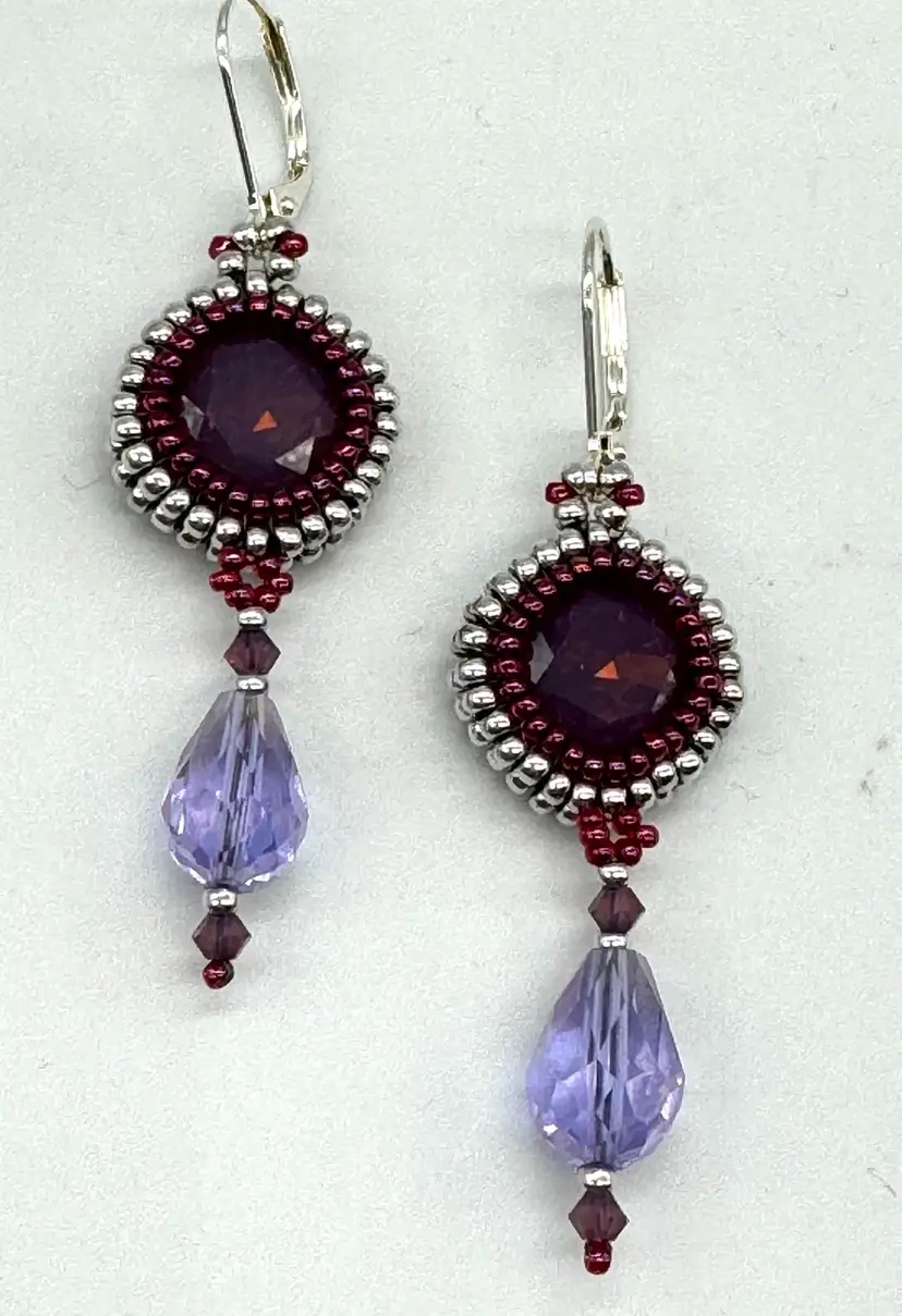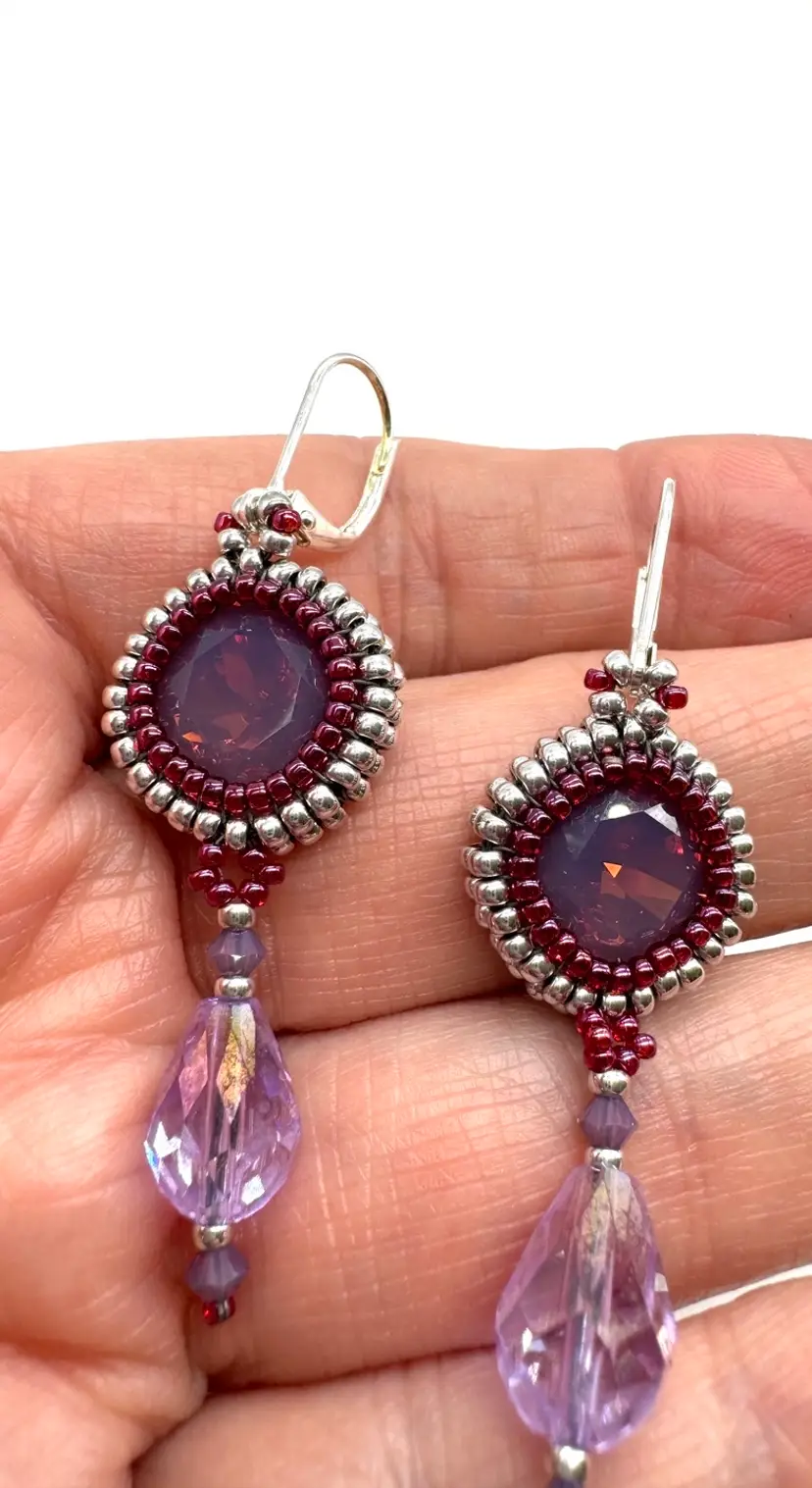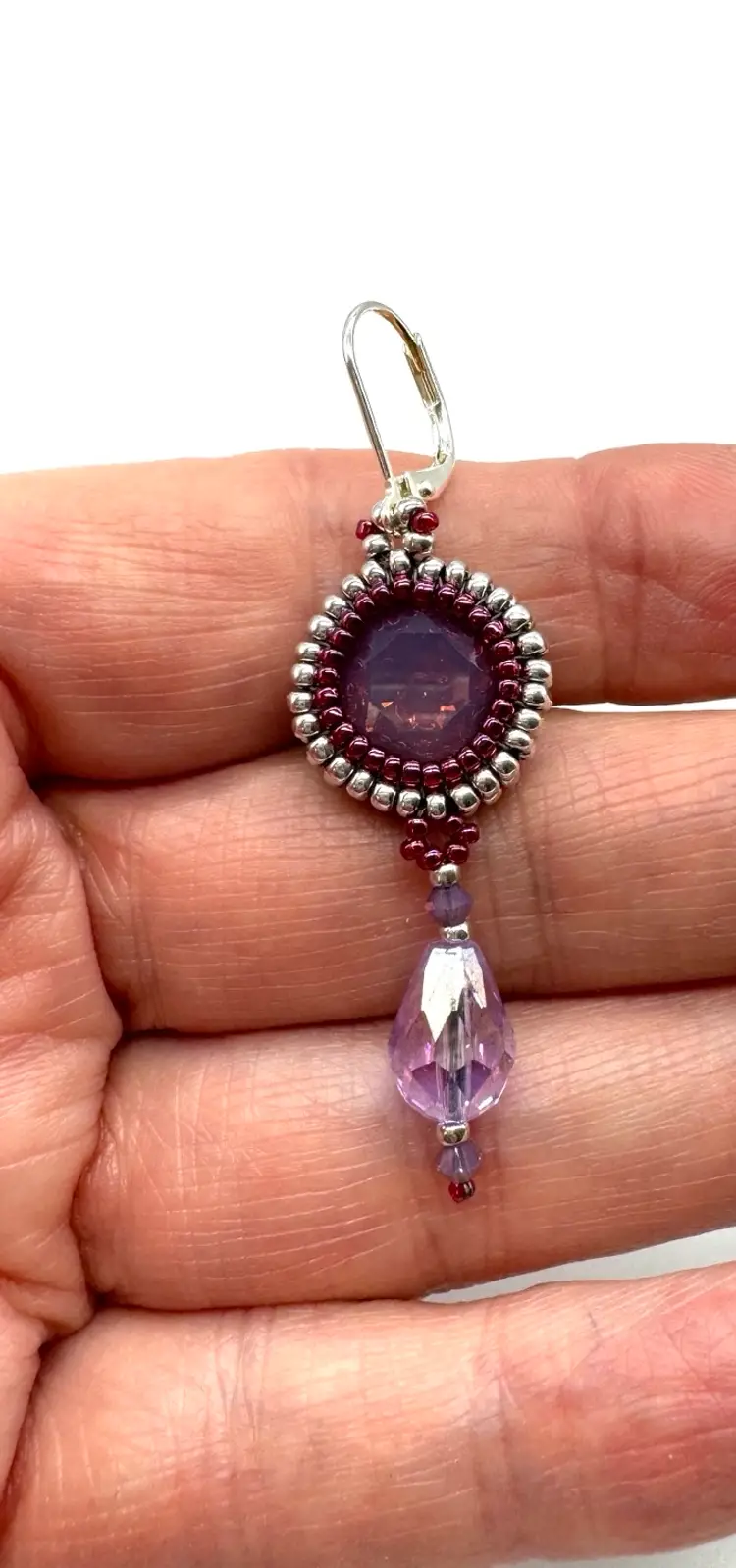 Hand made by me in my Seattle studio, this pair of dangle earrings are so much prettier in person. The drops and bicone beads will change color depending on the light The earrings measure 2.25” long and .75” wide. Leverbacks are sterling plated