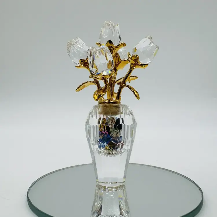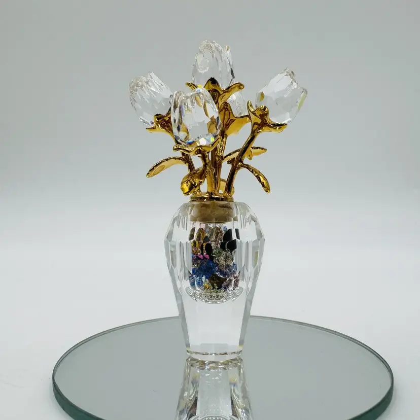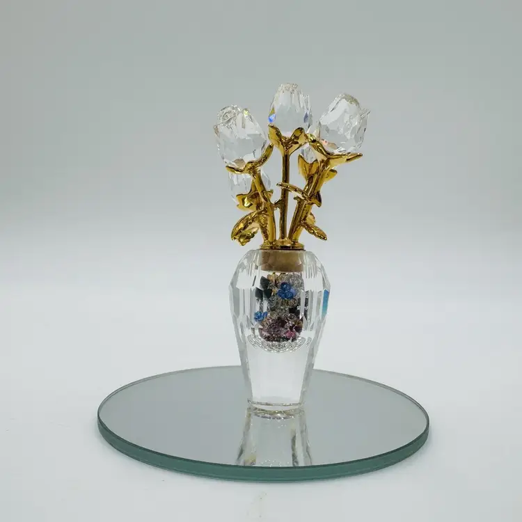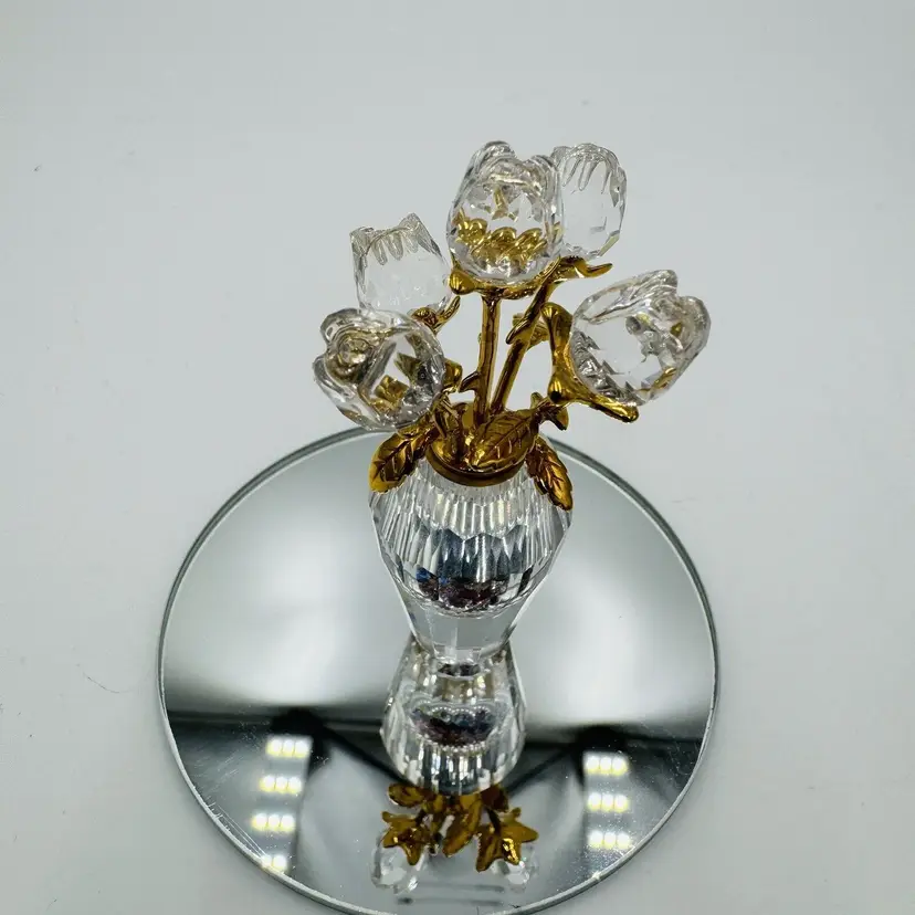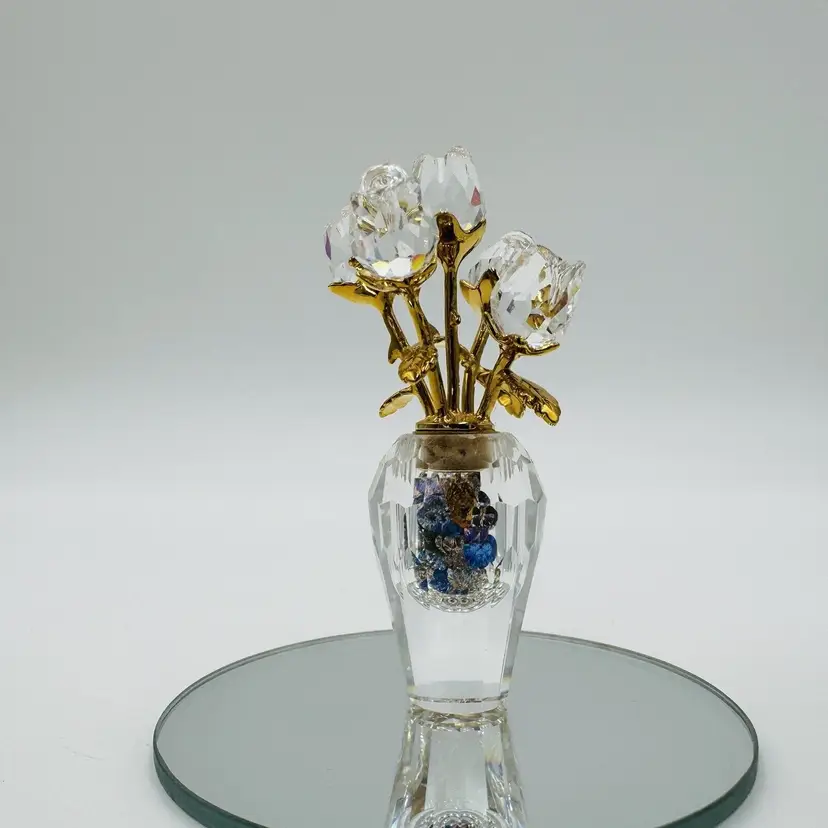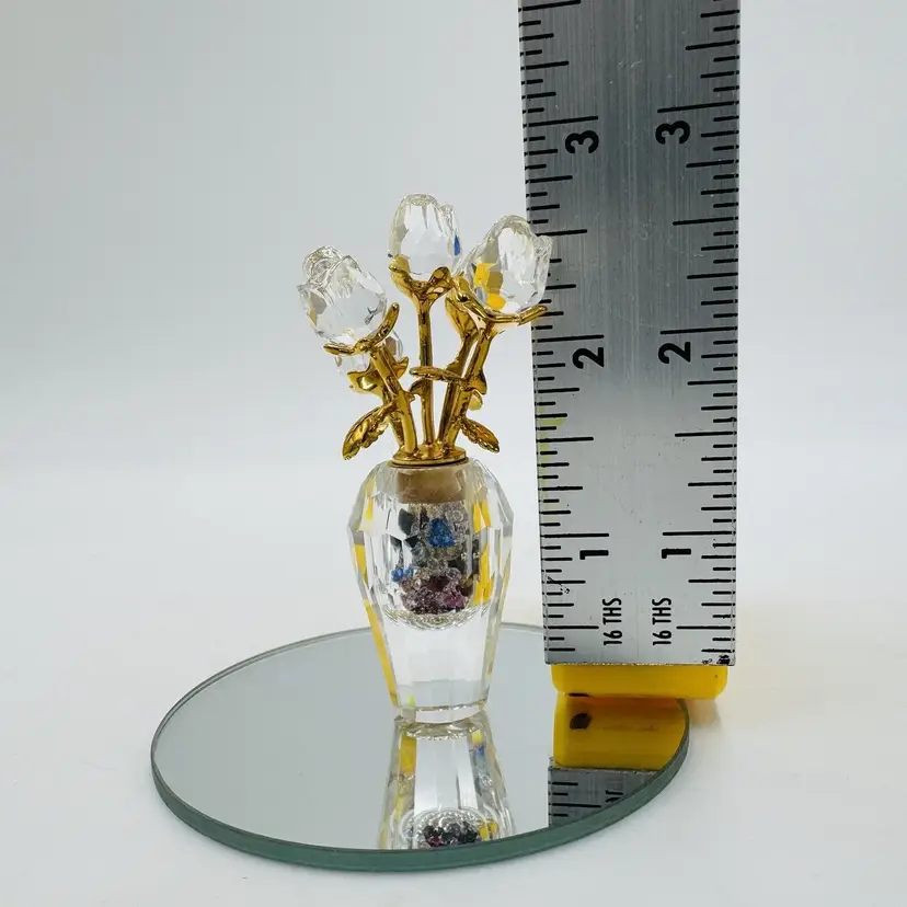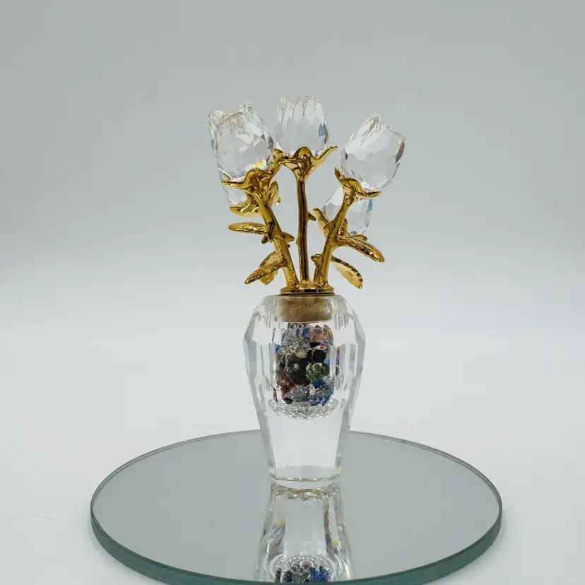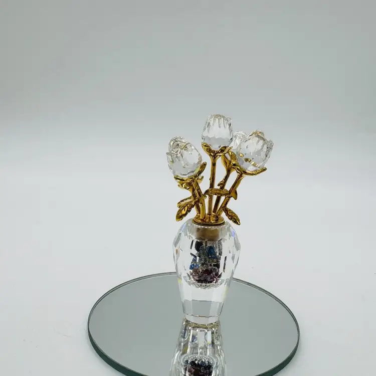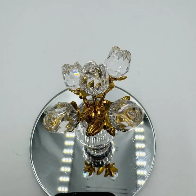Pattern: Roses Occasion: All Occasions Size: Small Color: Clear Material: Crystal Year Manufactured: 2002 Subject: Flower Brand: Swarovski Type: Figurine Department: Adults Item Height: 2.5" Number in Pack: 1 Packaging: Unboxed Collection: Crystal Memories Theme: Bouquet of roses Style: Contemporary Original/Reproduction: Original Features: Crystals Time Period Manufactured: 1990-1999 Country/Region of Manufacture: Austria Finish: Gold Room: Any Room Character Family: Roses Item Width: 1.5"