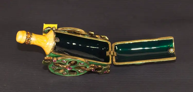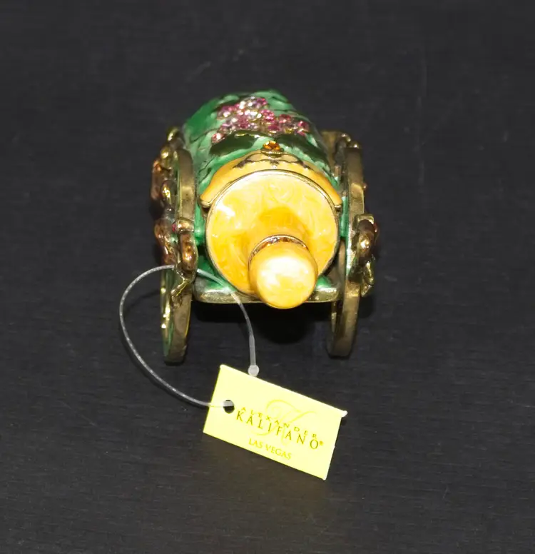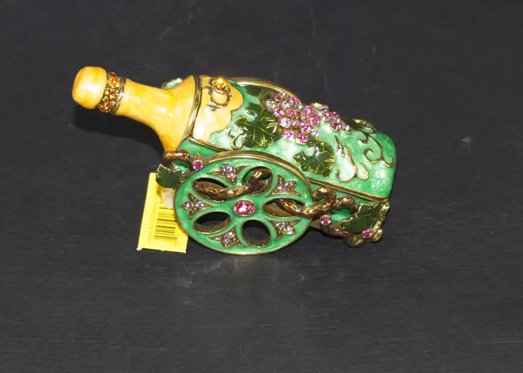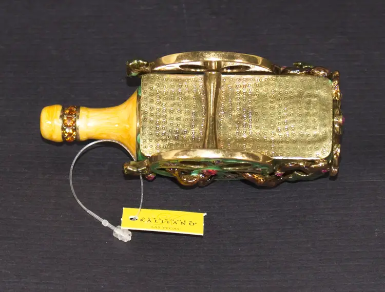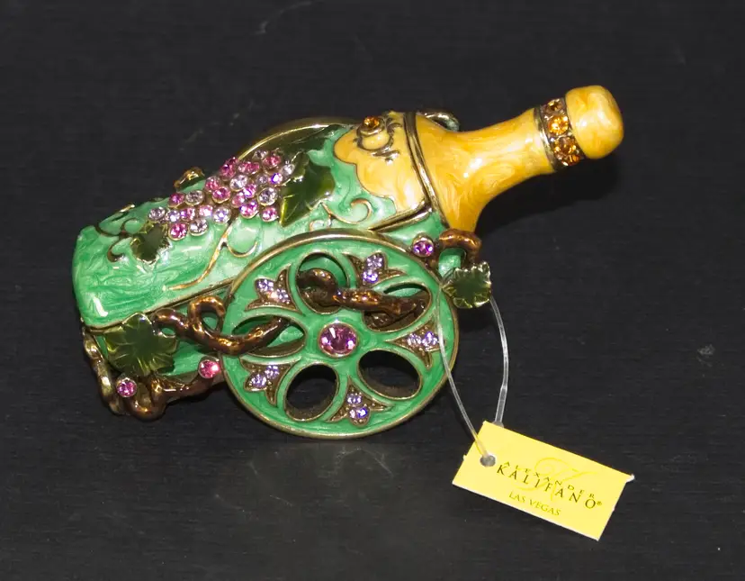 Swarovski Crystal Mini Wine Bottle Trinket Box Alexander Kalifano NWT. Enameled Metal. In good condition. 1.5" wide x 3.5" long x 2.25" tall