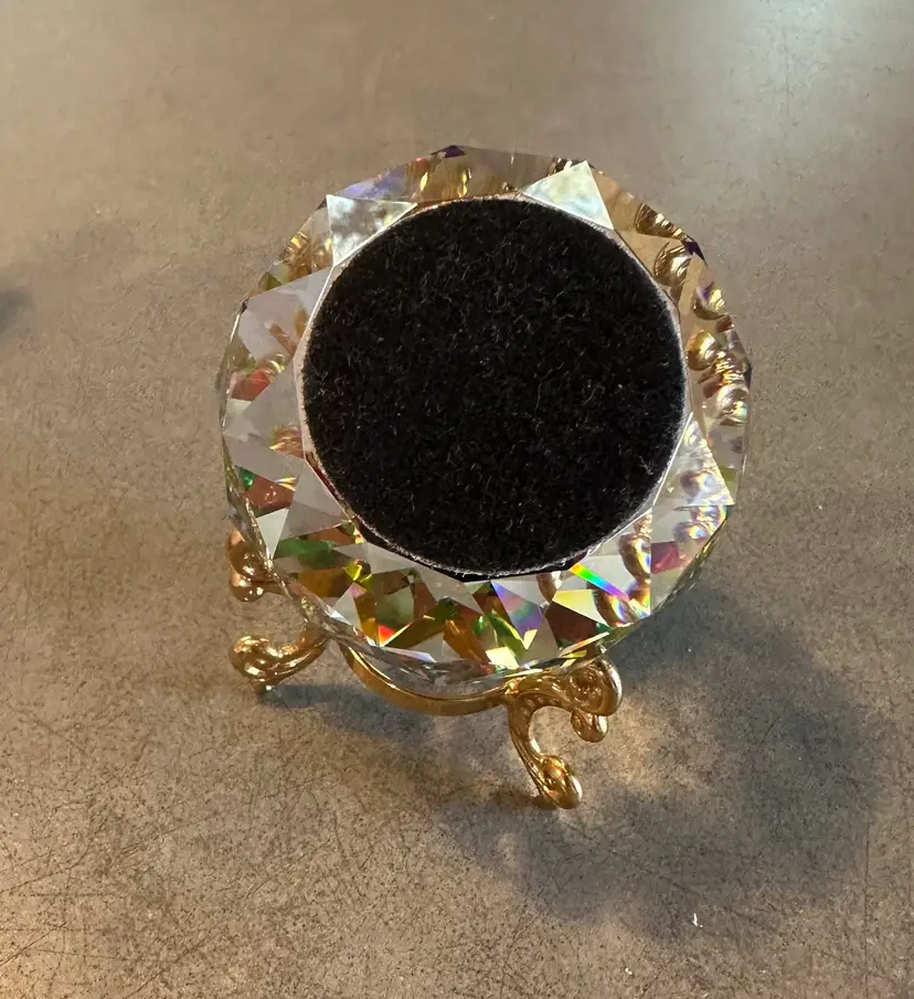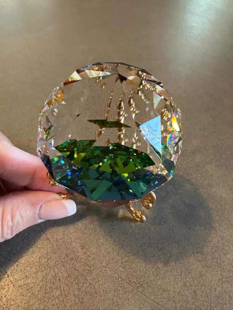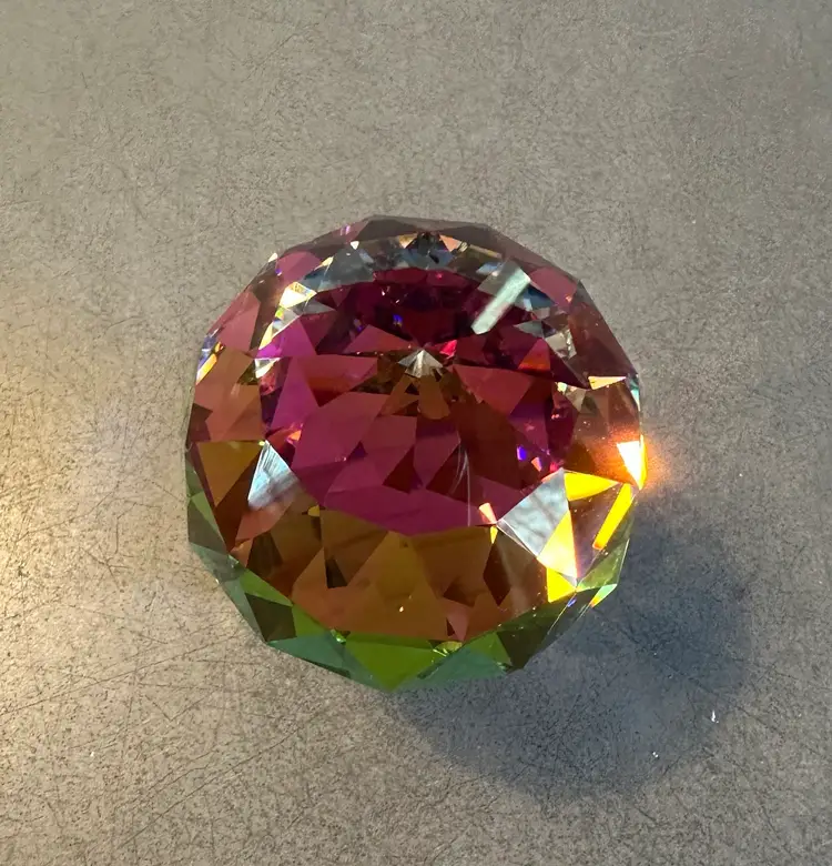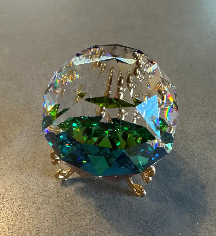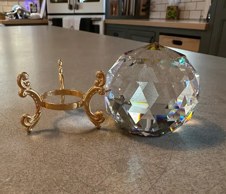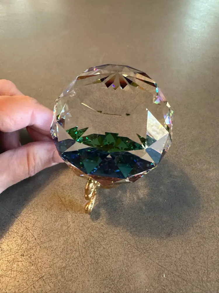 Swarovski Faceted Crystal paperweight with stand. The paperweight reflects the colors from the bottom. It is approximately 2.25” tall. Condition is very good, no chips, cracks or repairs.