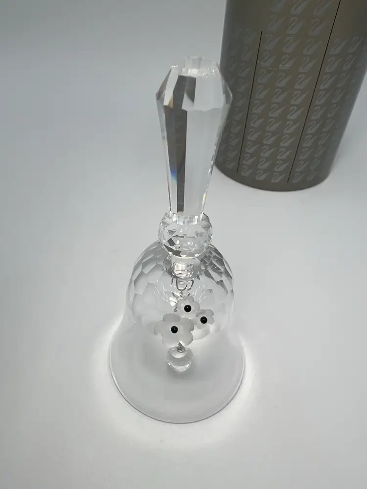 This stunning Swarovski Silver Crystal dinner bell is in perfect condition. Featuring 3 dainty frosted flowers with black centers on the front and beautiful sparkling cute in the crystal that catch the light & are absolutely enchanting.