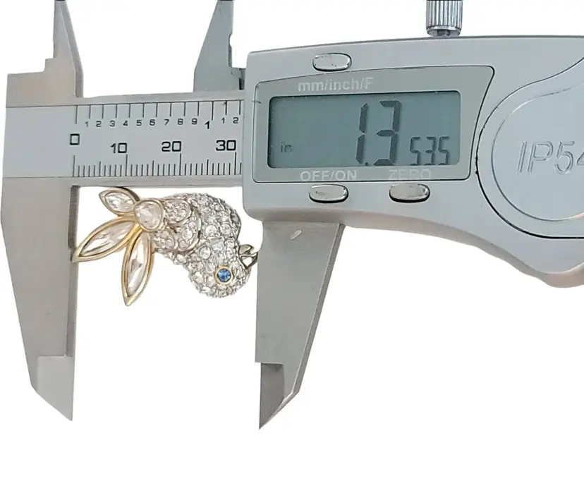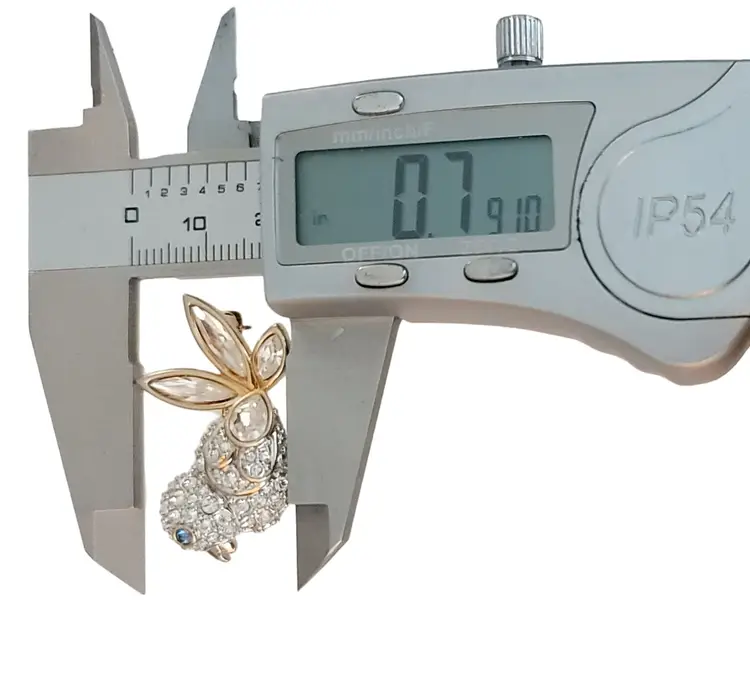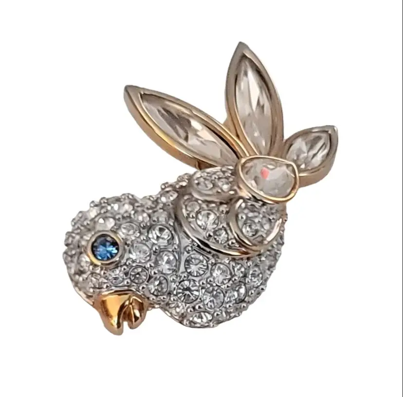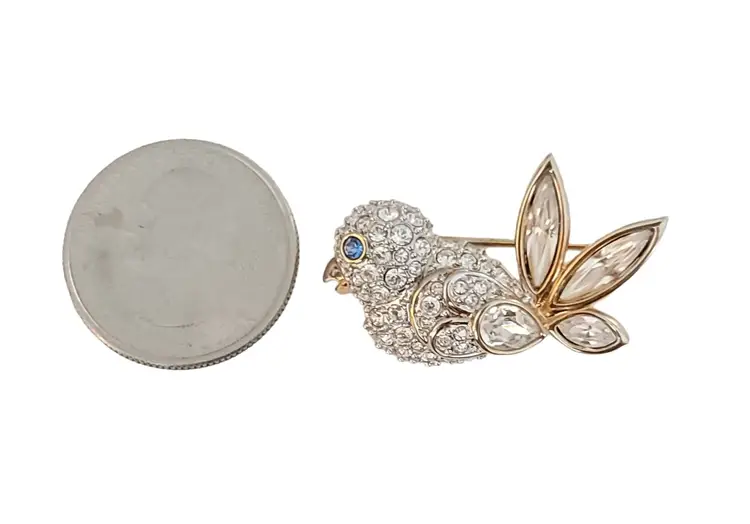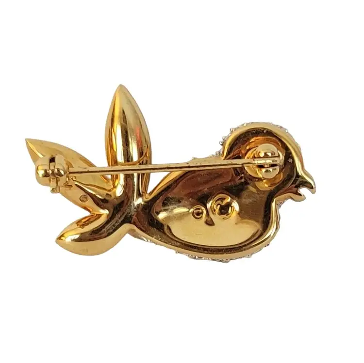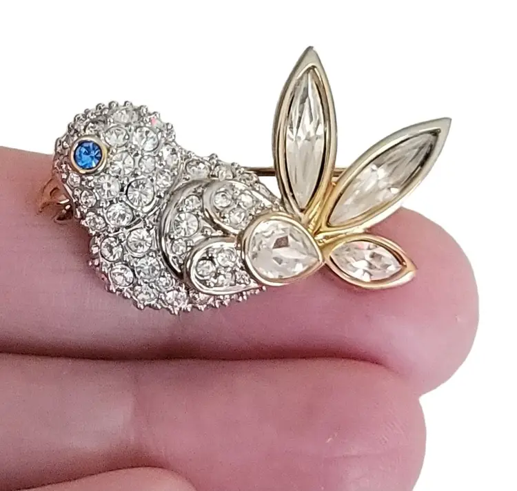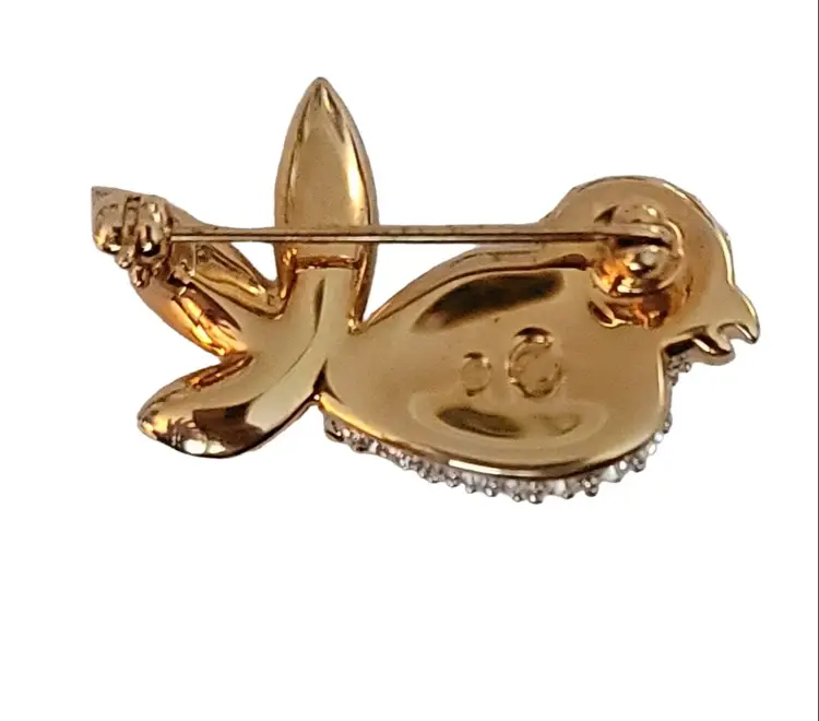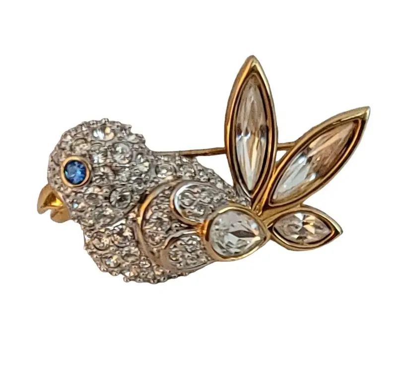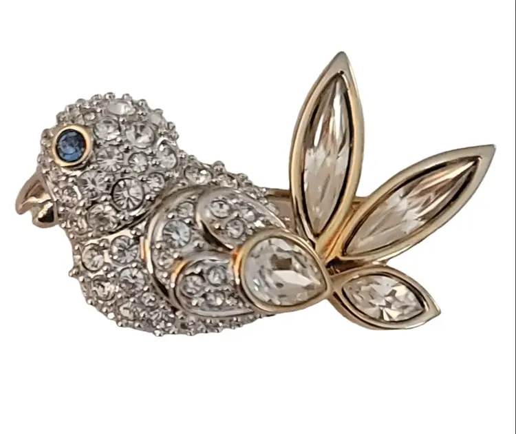 This stunning bird pin brooch by Swarovski is marked with a swan logo on the back. The three-dimensional bird figural features a whimsical design that displays a sparkling array of various size of clear rhinestones on a polished gold-tone metal. The wings are arranged in rows, the gold-tone feathers are embedded with clear marquise rhinestones. Measures approximately 1.3 inches in width and 0.7 inches in length. The back has a secure pin that is easy to fix on the back and can be firmly attached to your clothing.