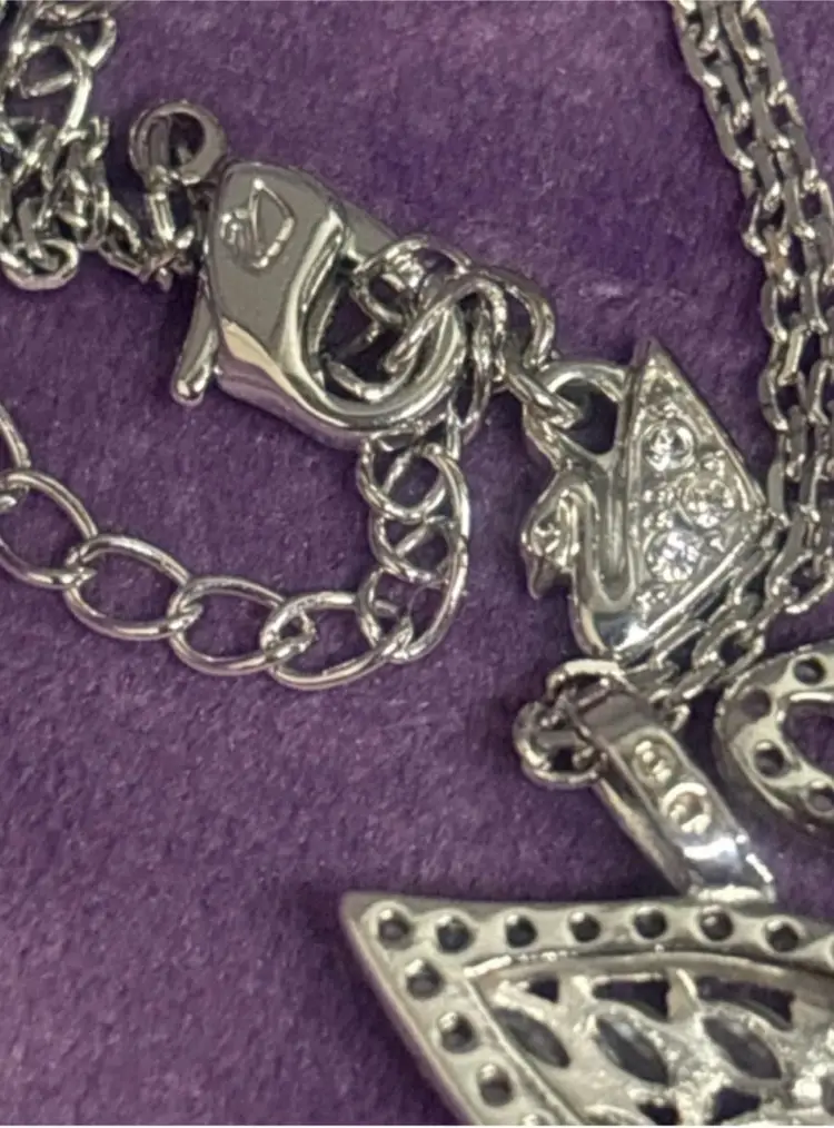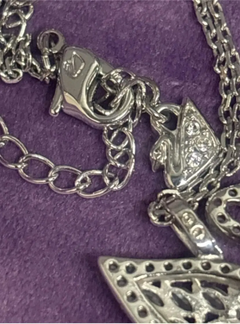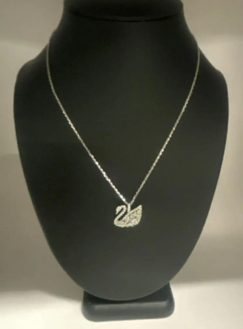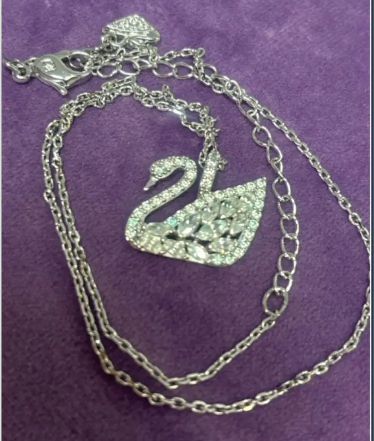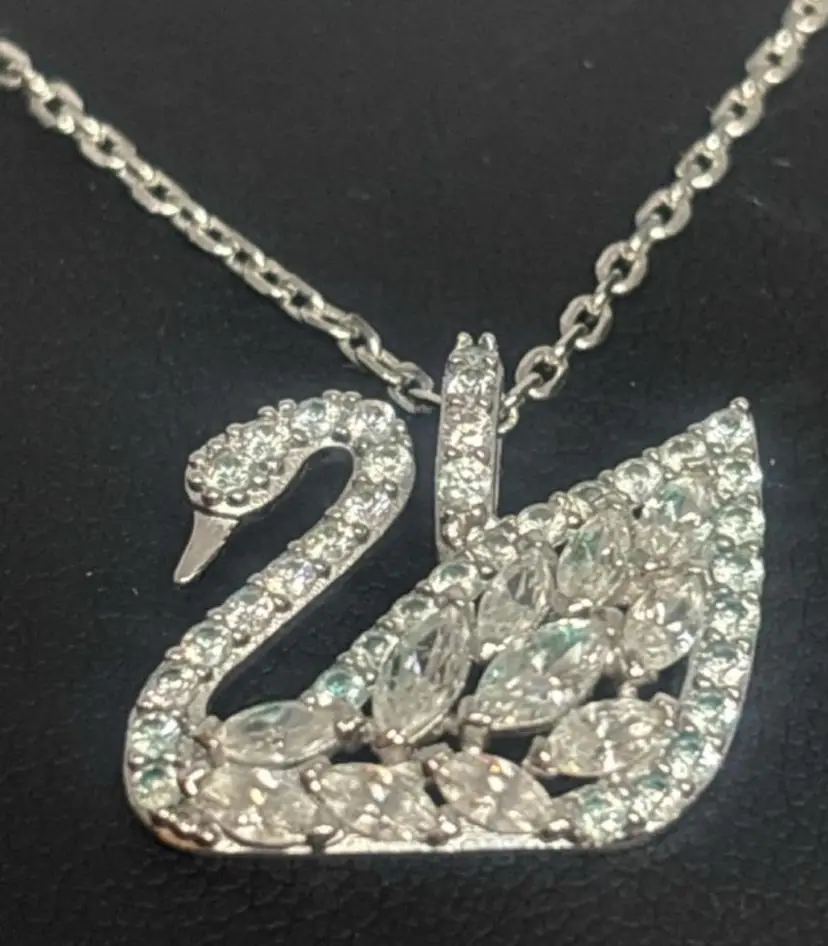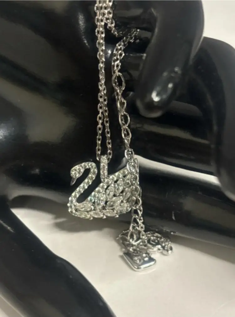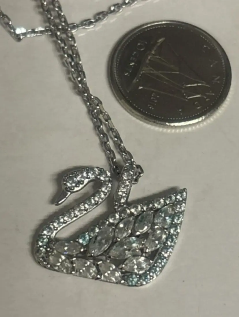 This is the larger Swarovski Swan pendant at approximately .5 x 1 inch. The swans graceful neck is curled as it swims along with all the lovely Swarovski stones. Stamped logo on back bale and on lobster clasp on 16’’ chain. Crystal swan hang tag on lobster clasp. Swarovski was Founded in 1895 in Austria.
