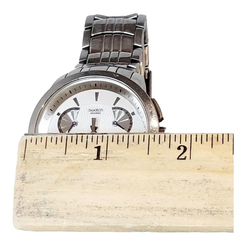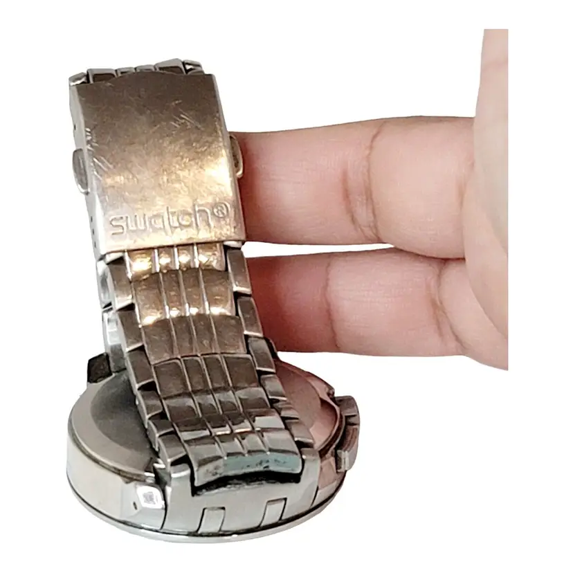 – Model: Swatch Irony – Department: Men – Style: Dress/Formal, Sport – Case Color: Silver – Modified Item: No – Type: Wristwatch – Features: 12-Hour Dial, Chronograph, Date Indicator – With Papers: Yes – Bezel Color: Silver – With Original Box/Packaging: No – Dial Color: Blue, Silver – Band Color: Silver – Reference Number: YRS402G - 2007 – Display: Analog – Brand: swatch