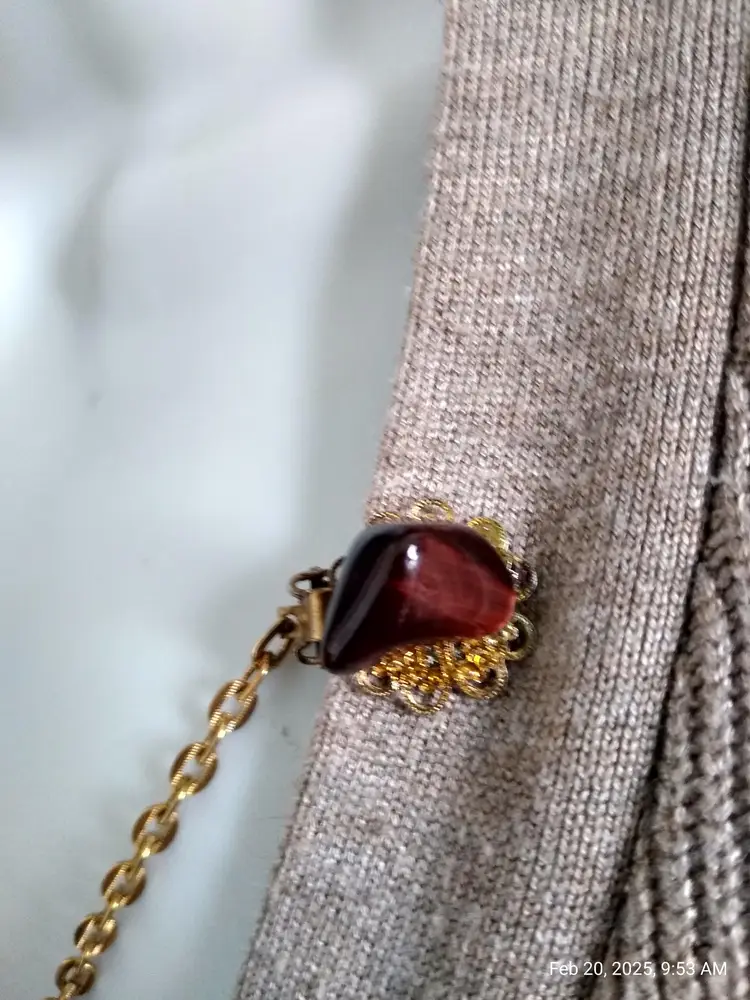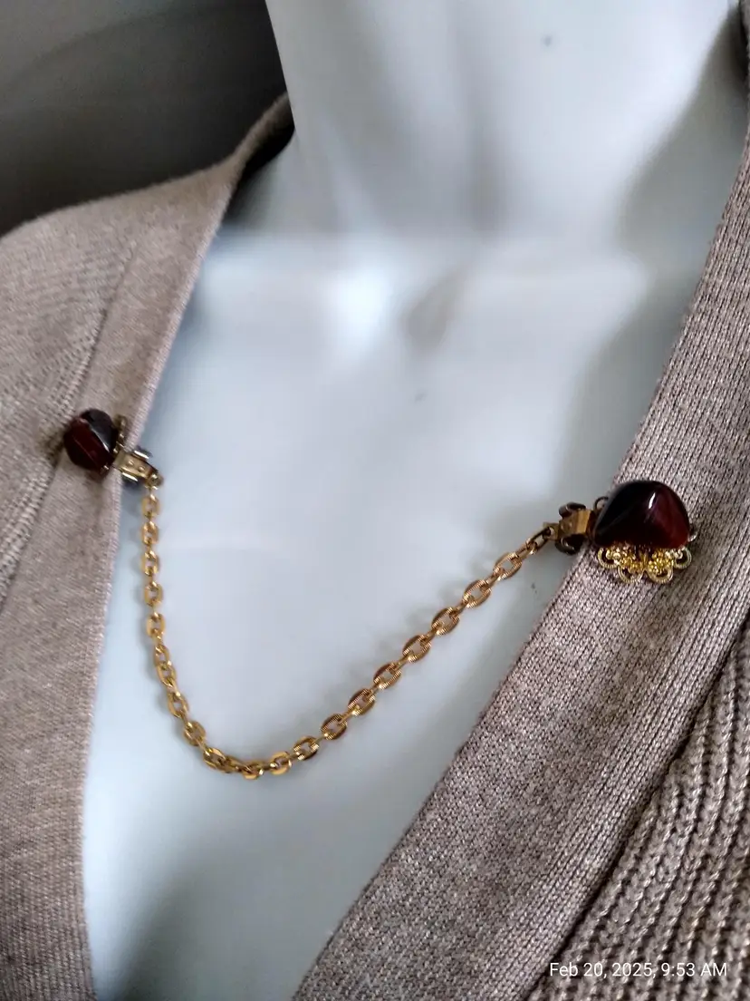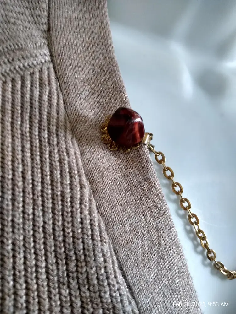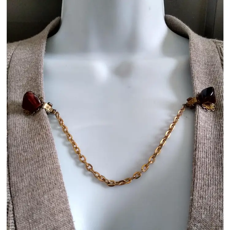 Add a touch of elegance to your outfit with this vintage sweater guard featuring rich tiger's eye accents and a 5" classic gold tone chain.