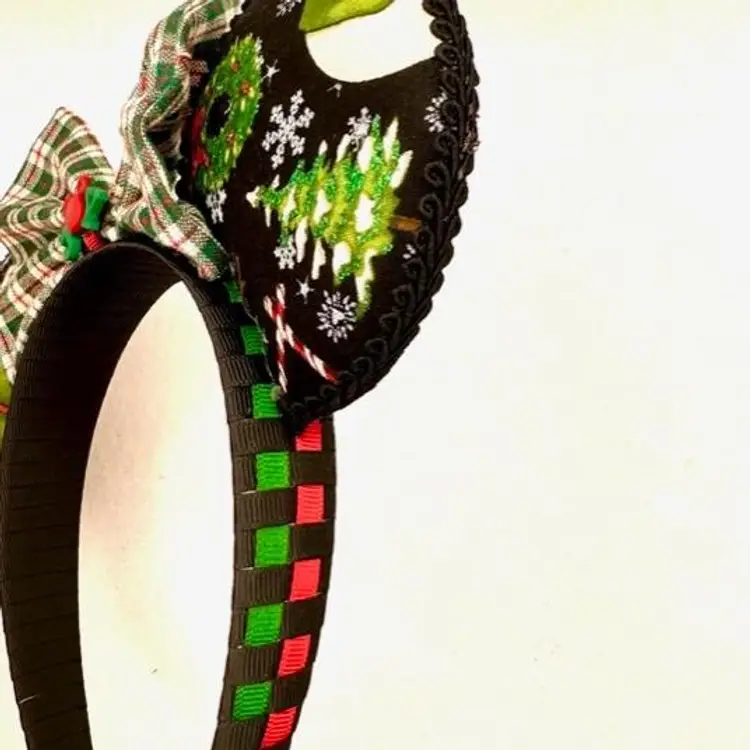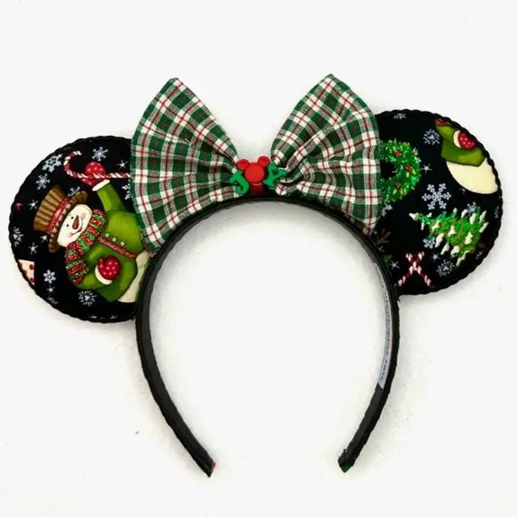 Spirited snowman with glittery accents on a black background are featured on these adorable holiday ears. The tri-woven red, black and green headband is finished off with a green plaid bow and a joyful glittery mouse silhouette spelling out the word "JOY." A great gift or perfect for your holiday adventures!