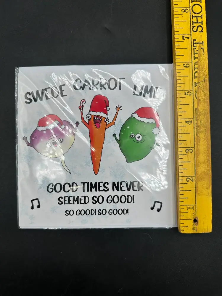 Hilarious. The gift that keeps on giving…a musical pun with veggies that have eyeballs and hands. Perfect unhinged holiday card to send!