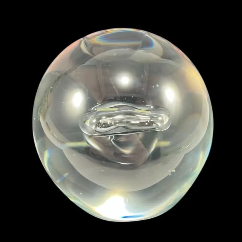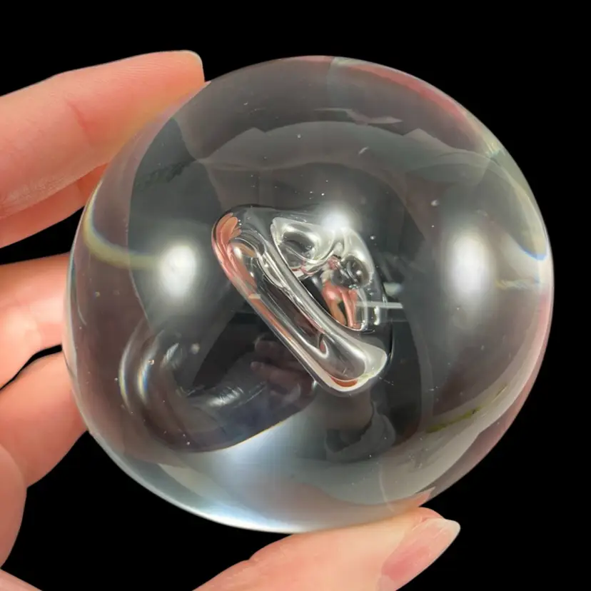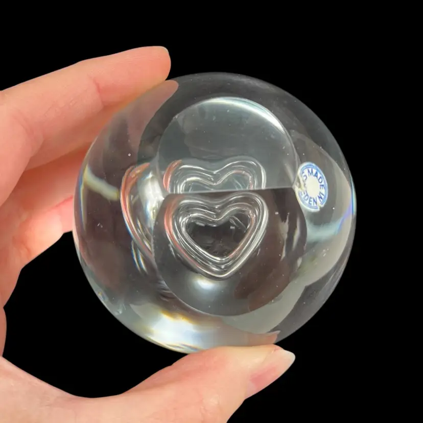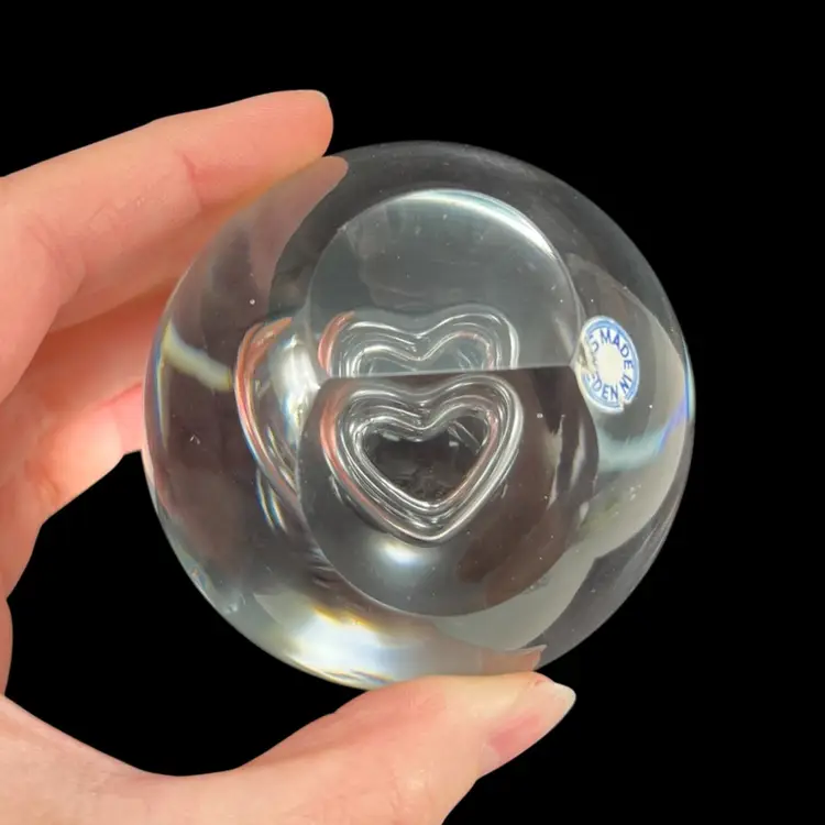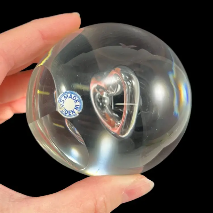 Approximately 3” tall and 2.75” in diameter. No chips or cracks. Please see the last two photos to see two inconsistencies in the surface. The first looks like where the glass or crystal was poured, which made a kind of bubble. The second looks like a spot missed when polishing, almost like a finger dragged across the surface and it’s slightly more flat & matte on that spot.