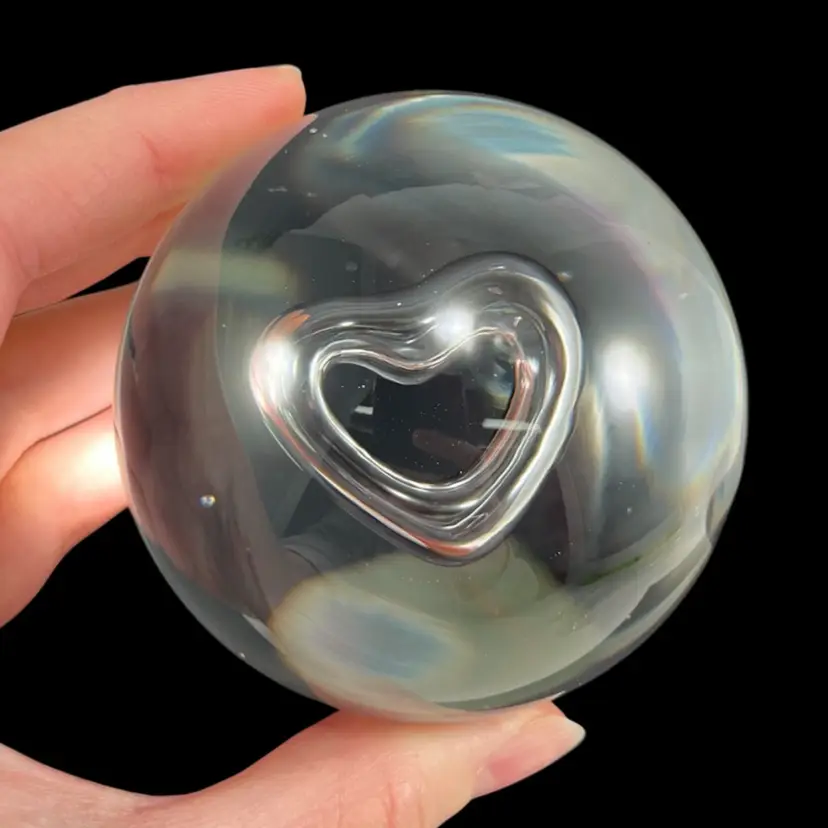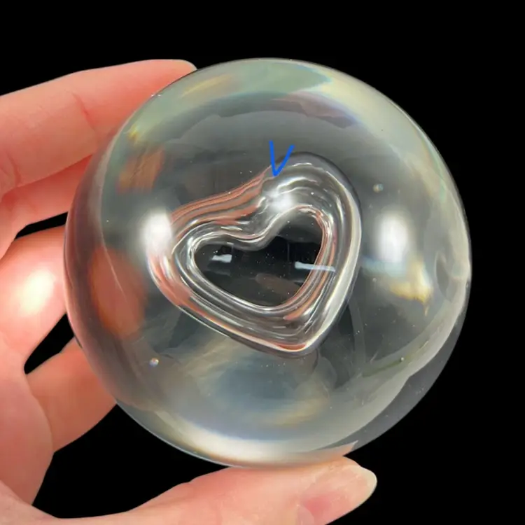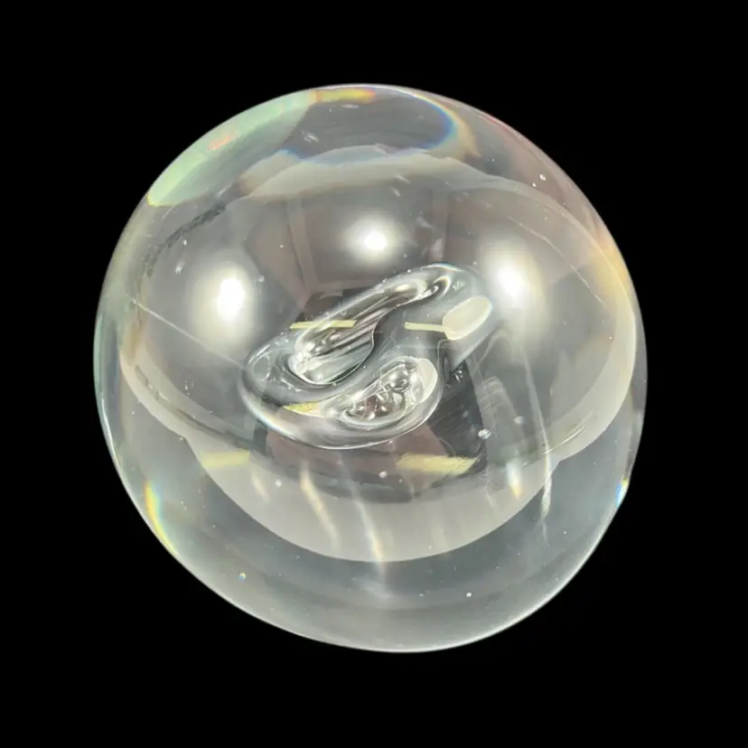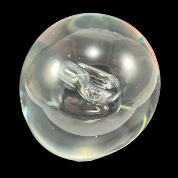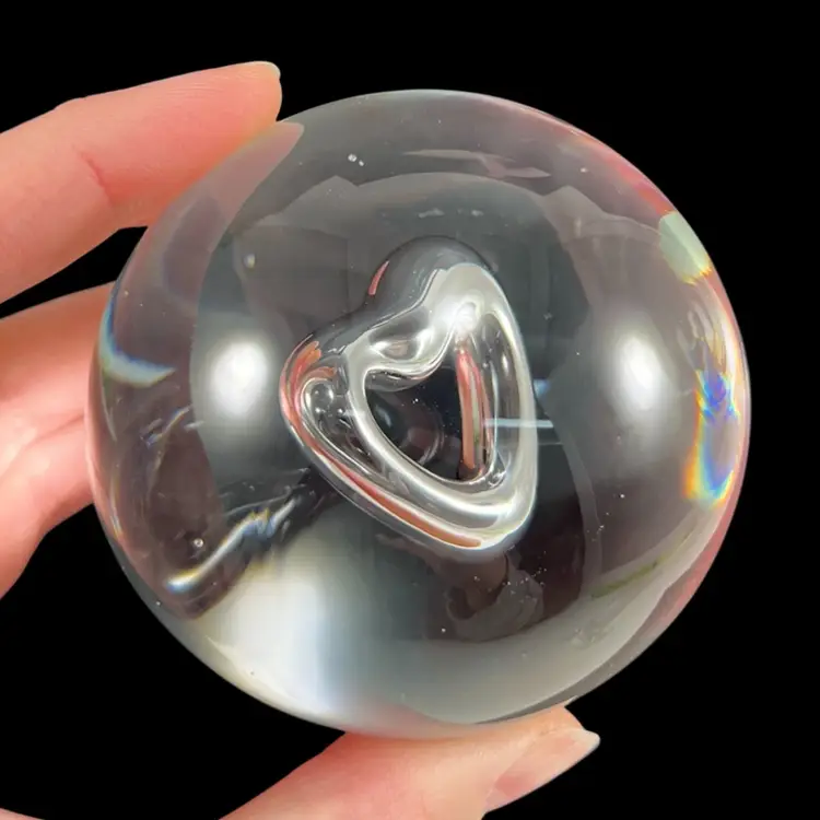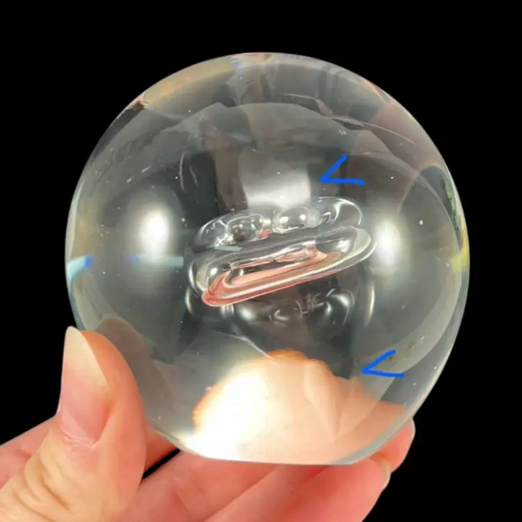 Approximately 3” tall and 2.75” in diameter. No chips or cracks. Please see the last two photos to see two inconsistencies in the surface. The first looks like where the glass or crystal was poured, which made a kind of bubble. The second looks like a spot missed when polishing, almost like a finger dragged across the surface and it’s slightly more flat & matte on that spot.