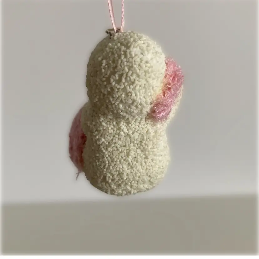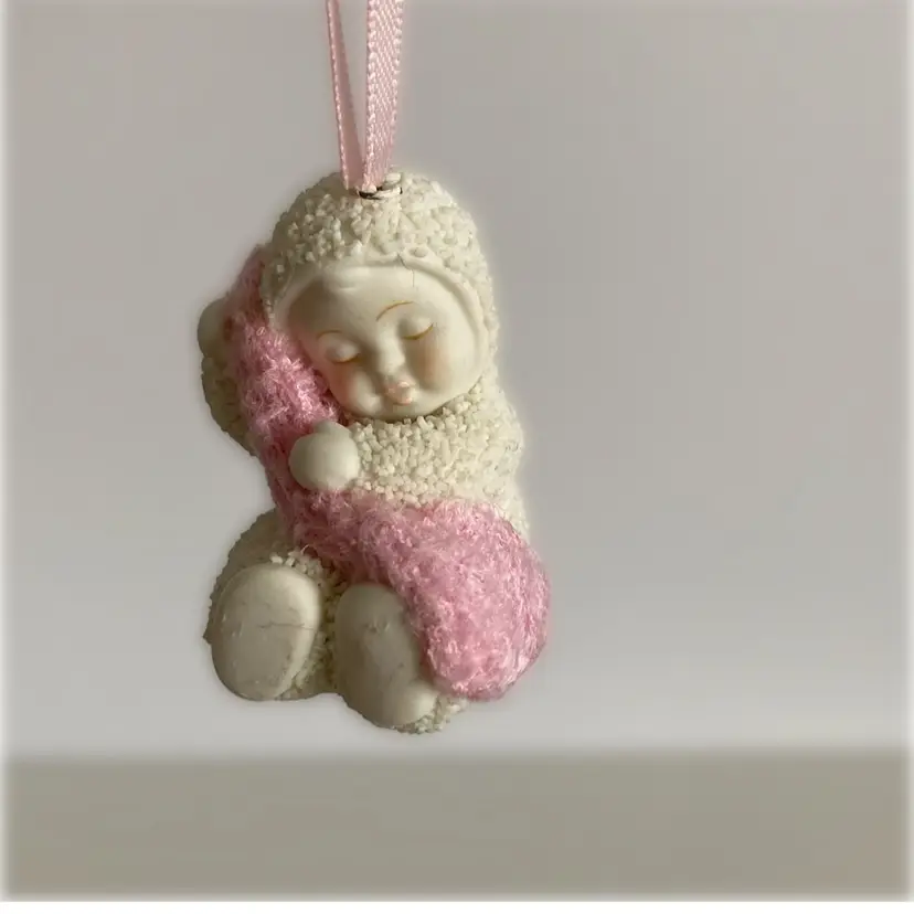 Sweet 2” snowbaby holding her pink blankie Christmas ornament.