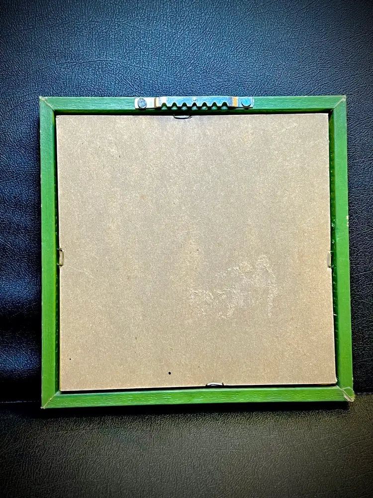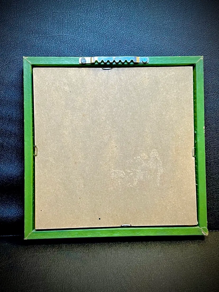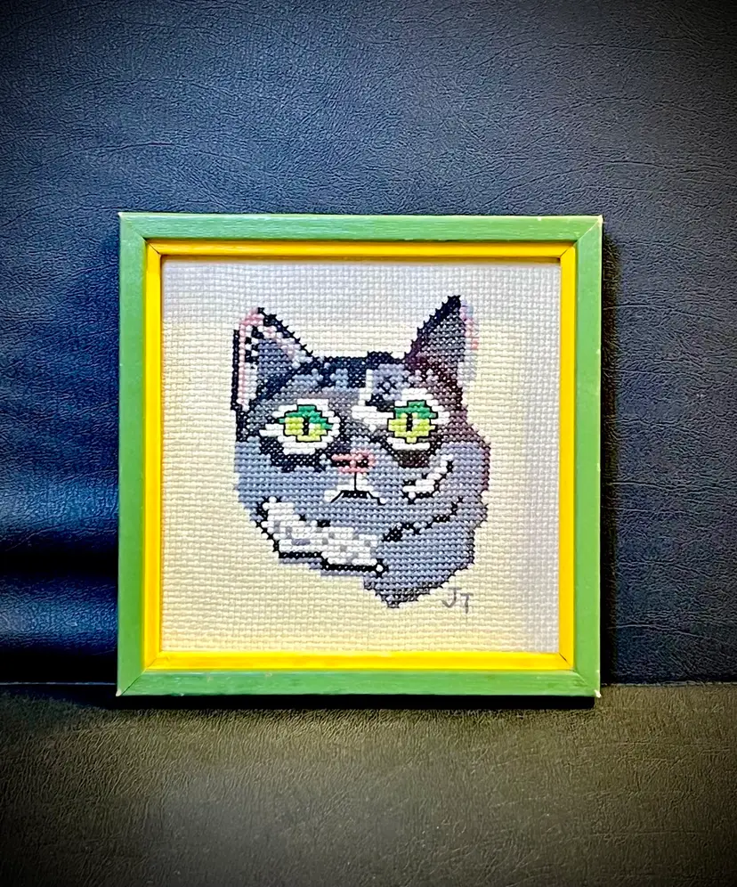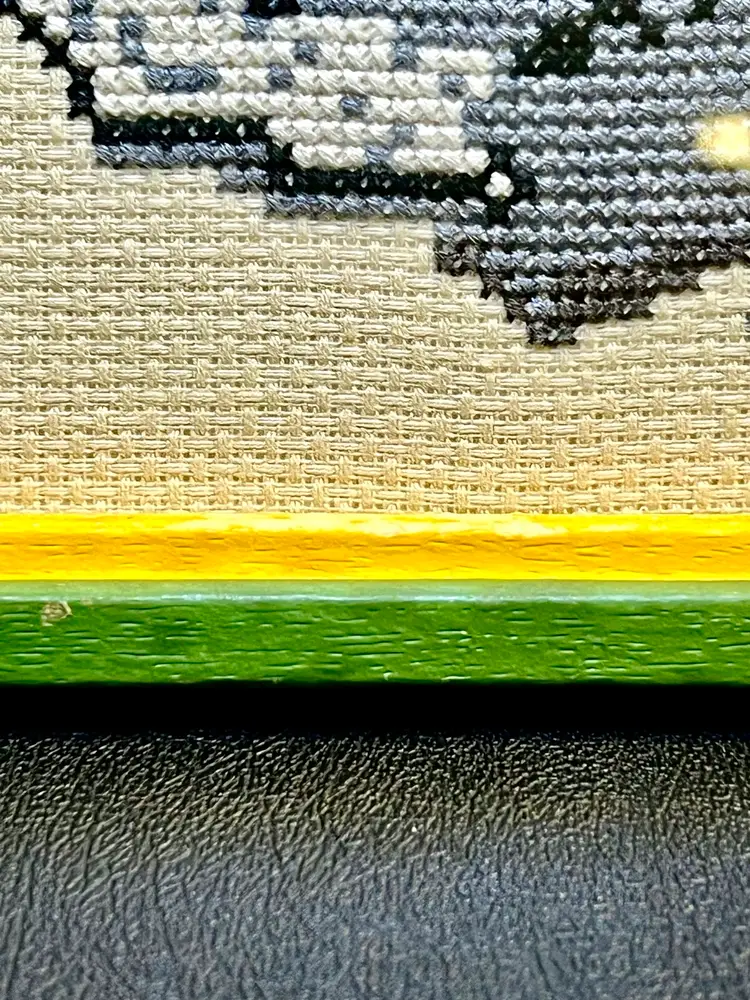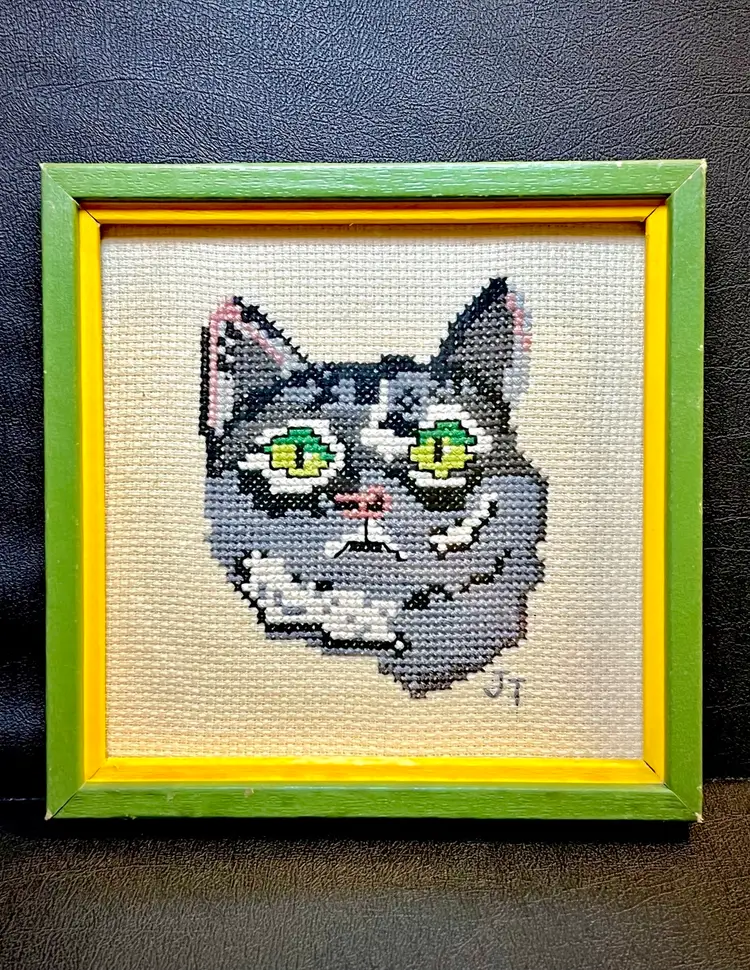 ๐Sweet gray kitty (looks like a tabby?) cross stitch in a green and yellow painted frame with glass. GVC (yellow paint on the bottom of the frame could be touched up), 7โx 7โ