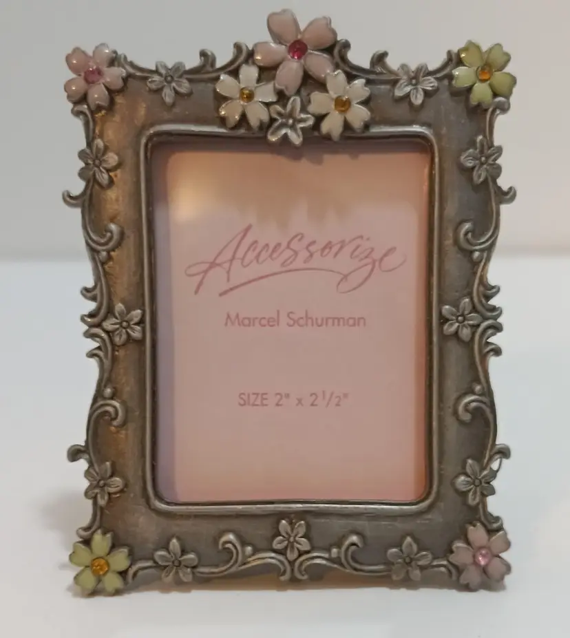 Sweet Little Enameled Floral Picture Frame With Rhinestone Crystal Embellishments; Adorable! By Accessories from Marcel Schurman; Holds 2" x 2.5" pic; Frame is 2.5" W x 3.25" Tall; no chips or scratches; Sturdy!