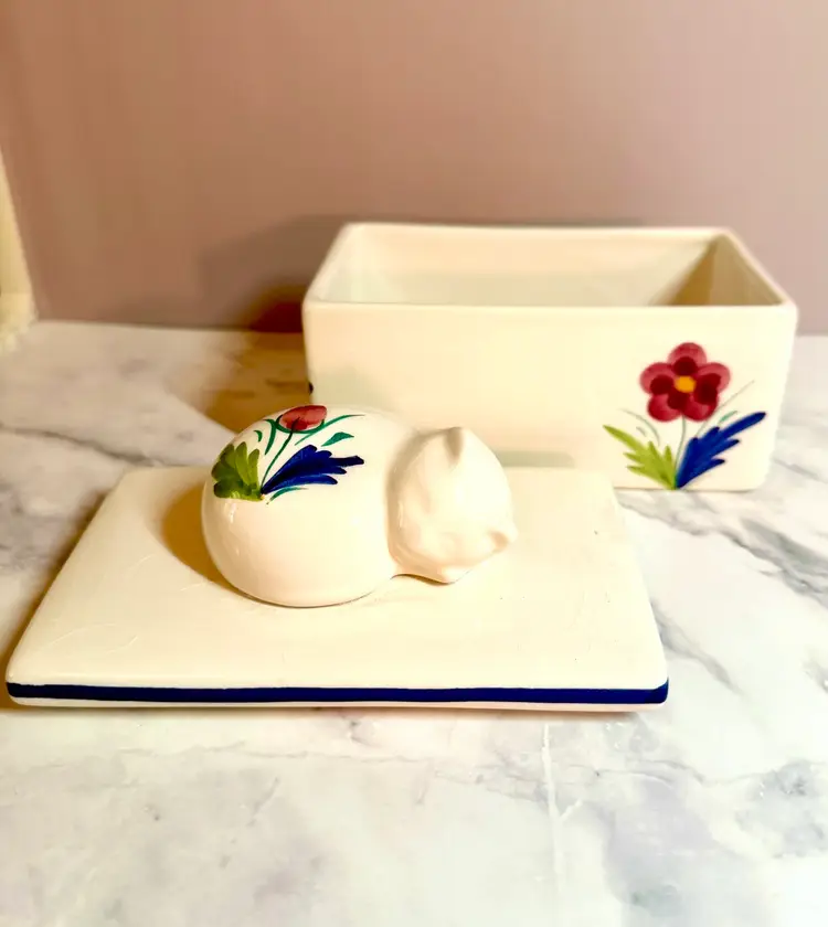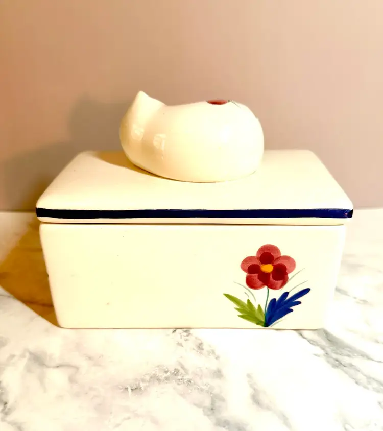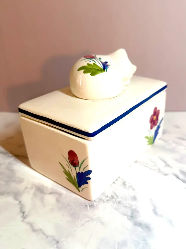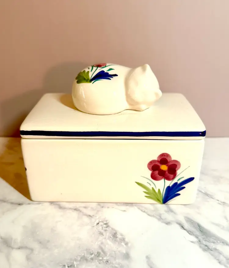 This vintage porcelain sleeping Kitty Cat lidded trinket/jewelry box would make a graceful addition to any dresser or vanity w/its sweet simplicity. 5.5”Lx3”Hx4”D, EUC, made in Portugal