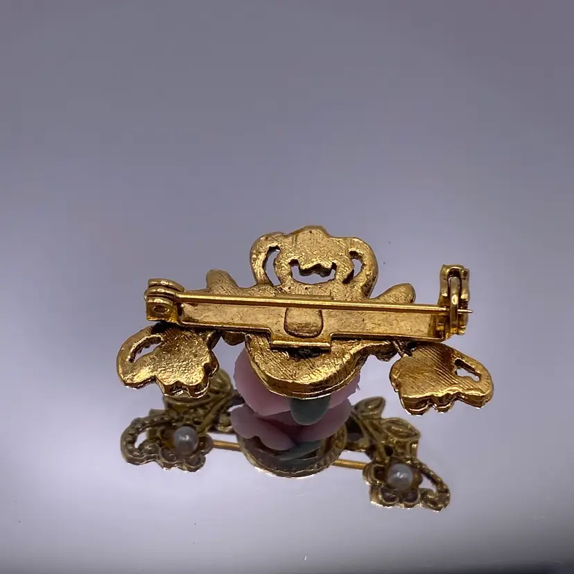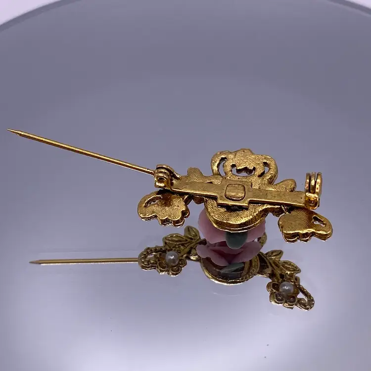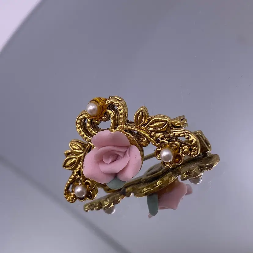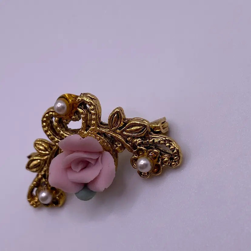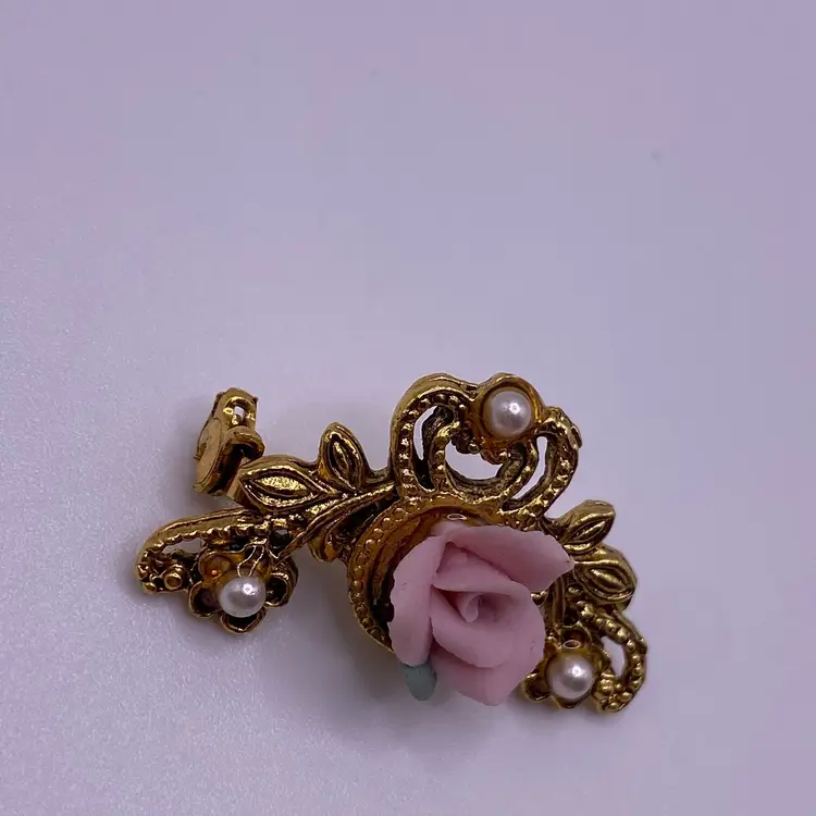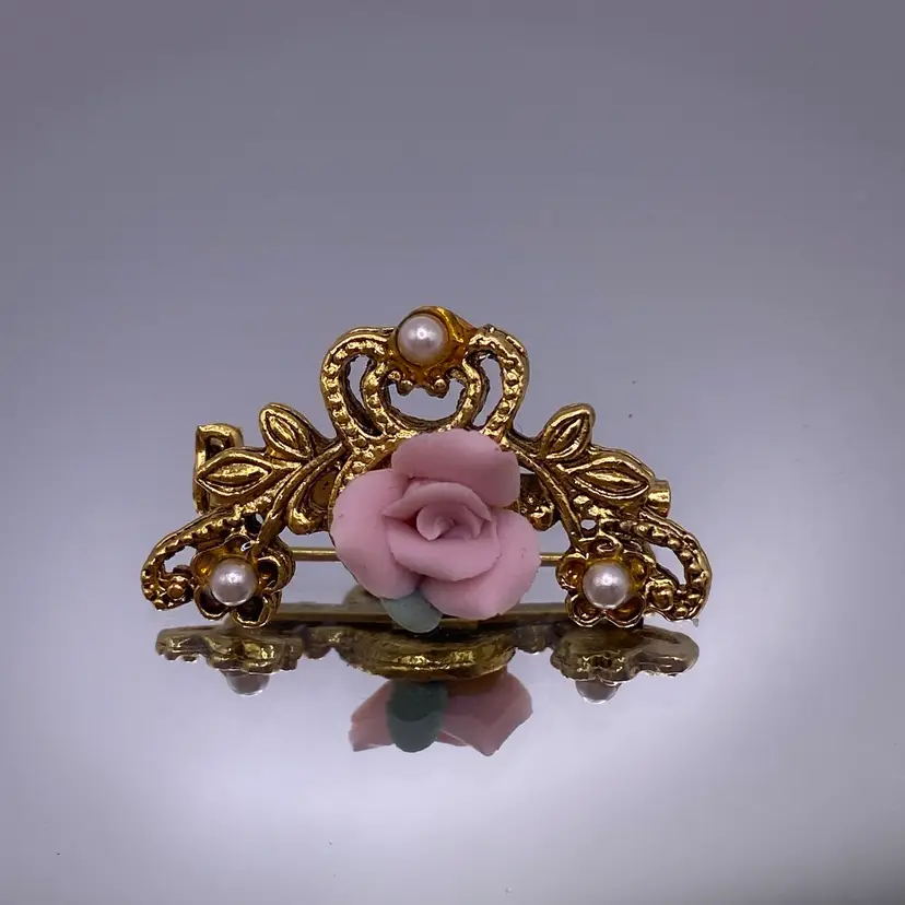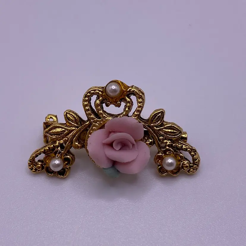 Add a touch of elegance to any outfit with this beautiful Victorian style brooch. The delicate pink porcelain flower design is accented with faux pearls and a gold tone metal finish. Measuring 1.25 inches in length, this brooch is perfect for any occasion and is sure to make a statement.
