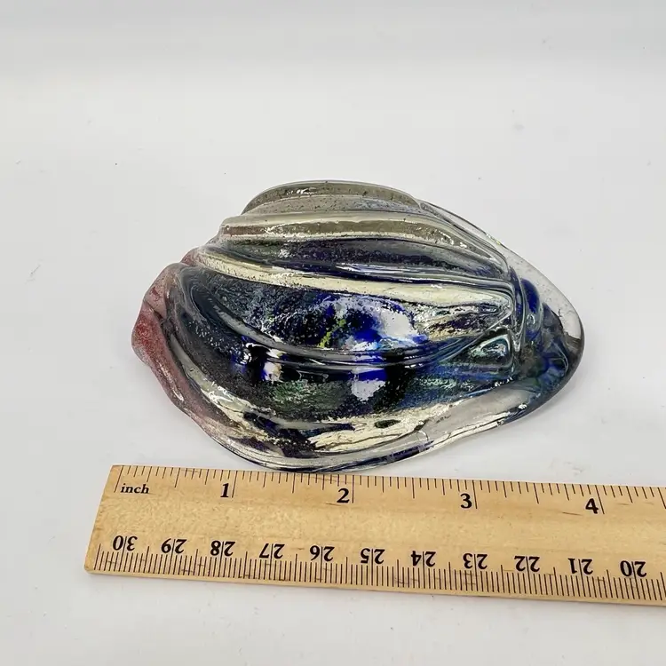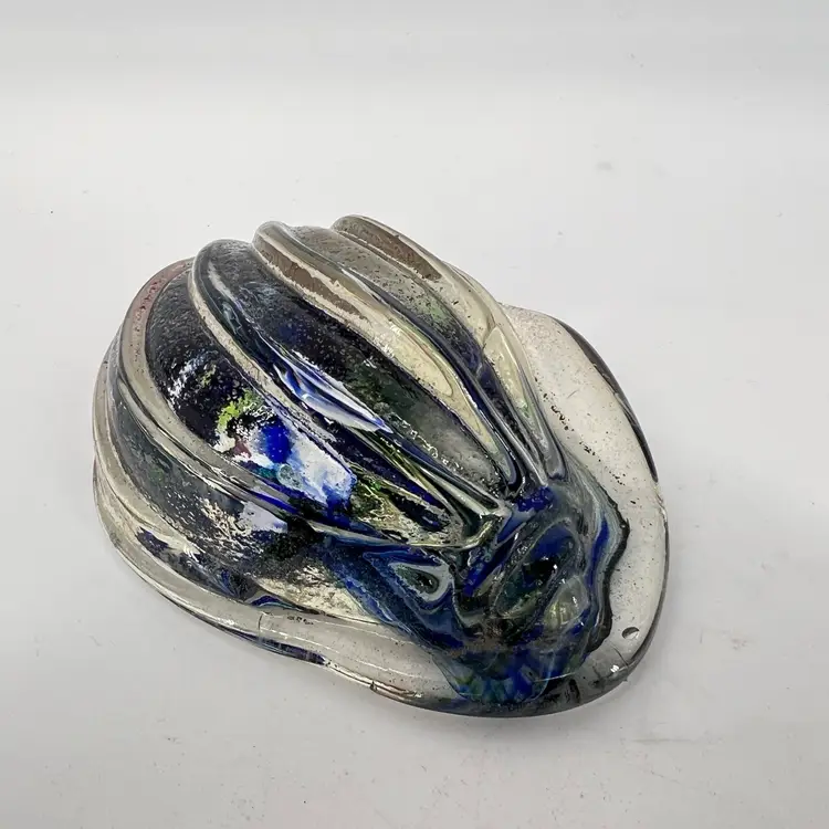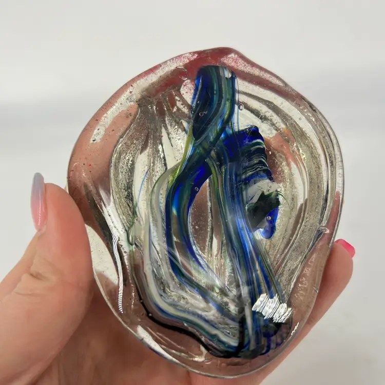 This art glass paperweight is molded. It has a blue swirl encased in clear. It measures approx 4” long.