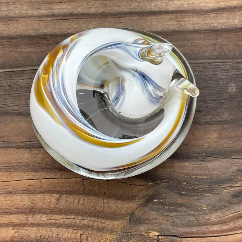 This charming curled-up cat figurine is crafted in heavy art glass with elegant swirls of amber, white, and soft blue throughout. Under 365nm black light, the glass emits a vivid green UV glow, indicating manganese or uranium content in the formulation—a unique detail prized by collectors.