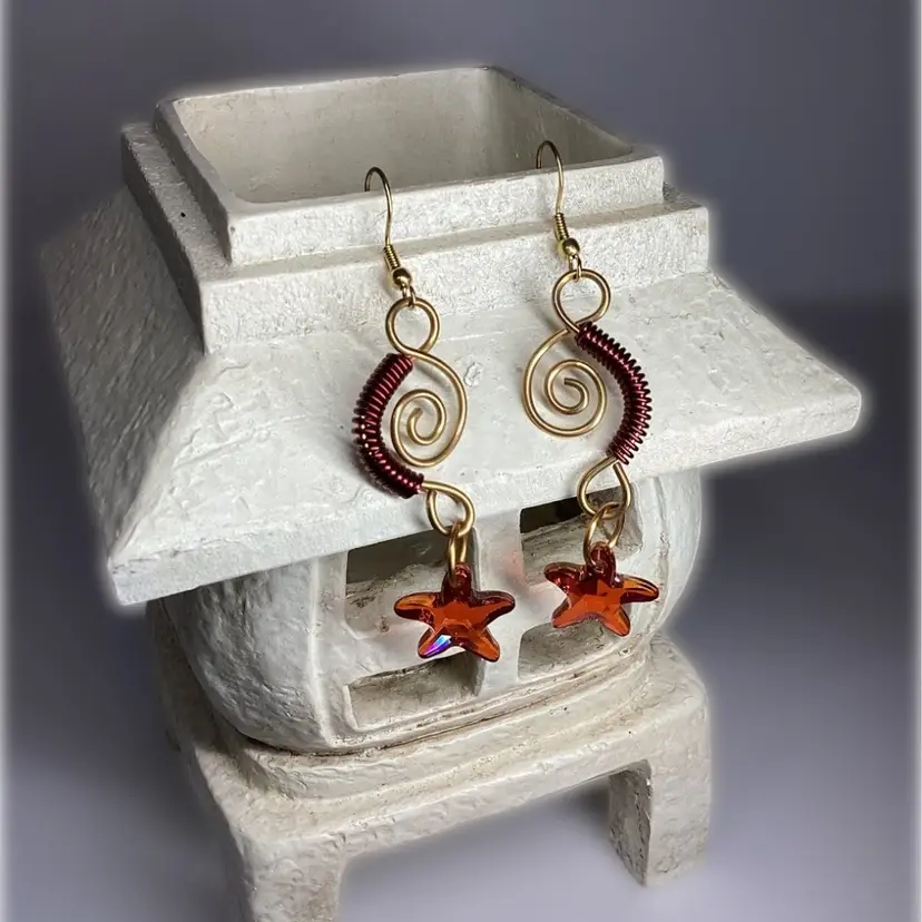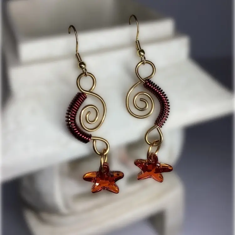 Light or dark brass swirls with burgundy coils dangle with from either gold tone or brass ear hooks with golden brown Swarovski starfish with an Aurora borealis coating. #swarovski #starfish #ooak #burgundy #wdesigns #handmade