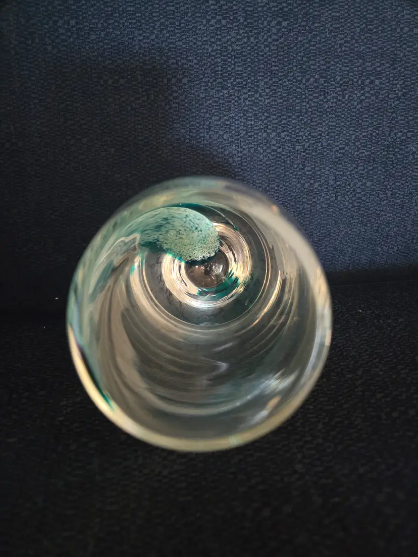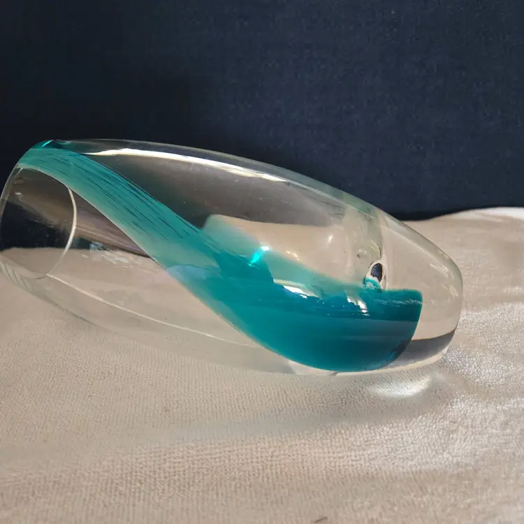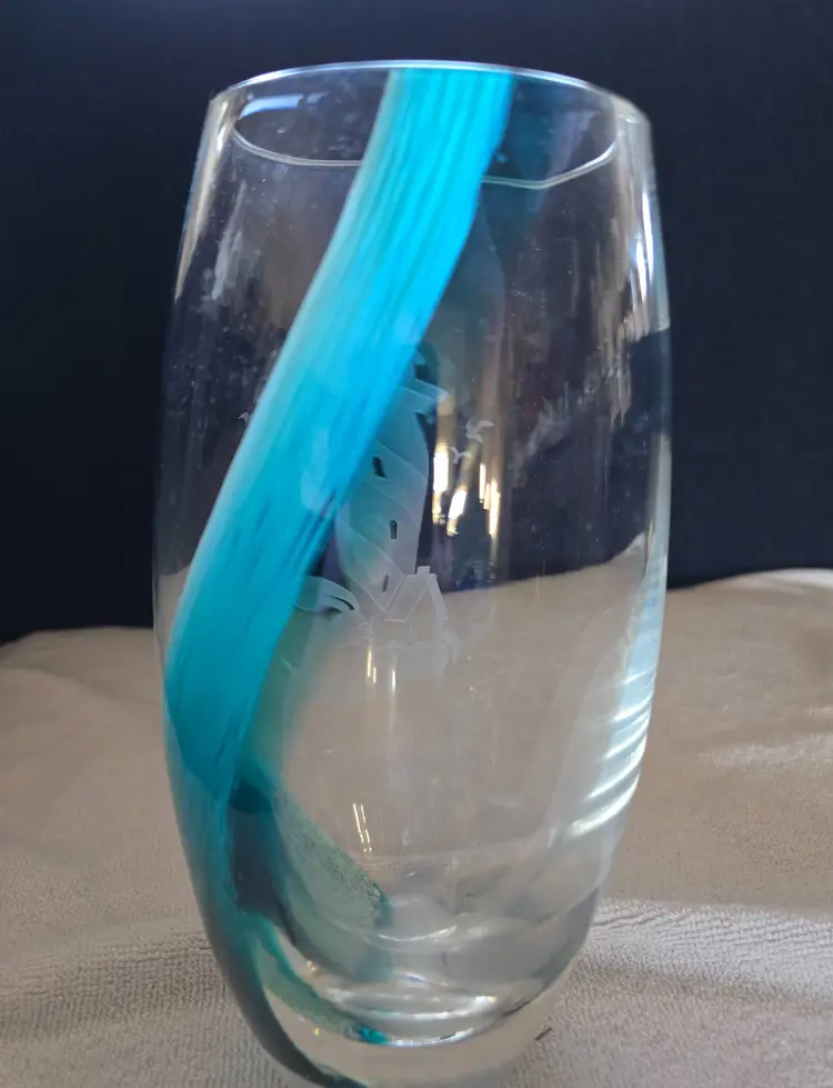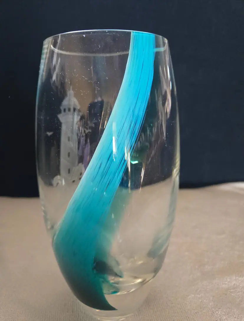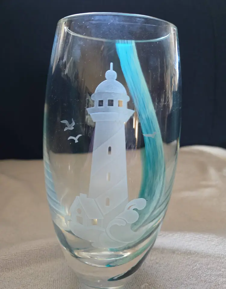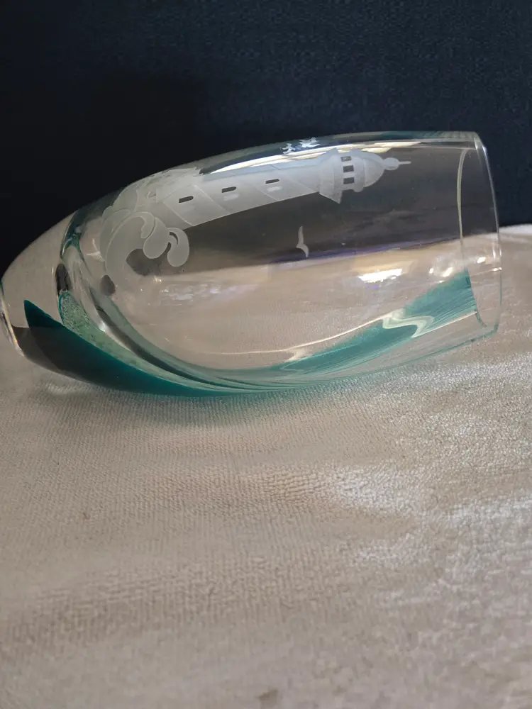 An art Glass vase by the artisans Caithness Glass crafted for Lenox. A retired piece featuring a seaside scene with a lighthouse and surging sea. Southbound with swirls of teal color hand layered into the glass. The seascape, lighthouse, and shore are hand etched. The Lenox hallmark is sandblasted onto the bottom. Made in Scotland. Stands 8" tall and has a 3" opening on the top. No chips, cracks, or repairs. In excellent condition.