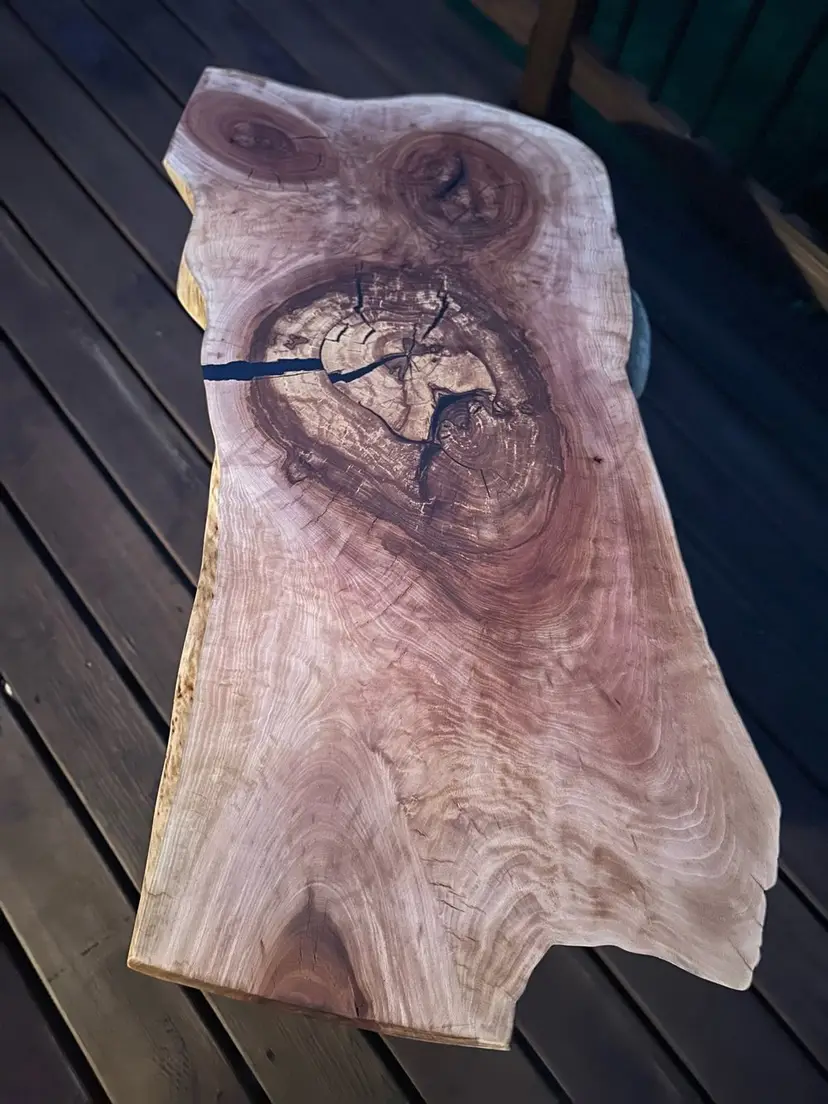 Beautiful sycamore slab coffee table fortified and accented with black epoxy with a beautiful tulip base from Flowyline Design.