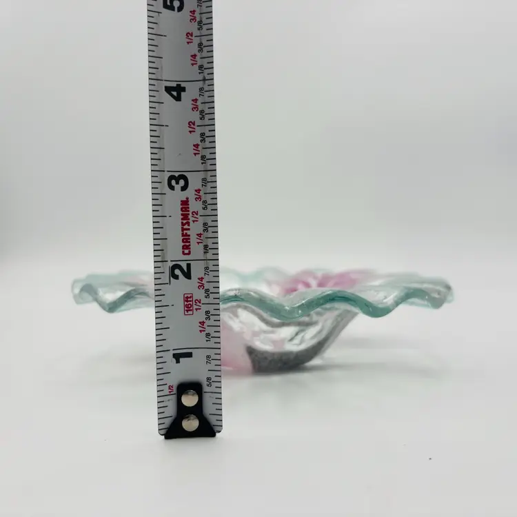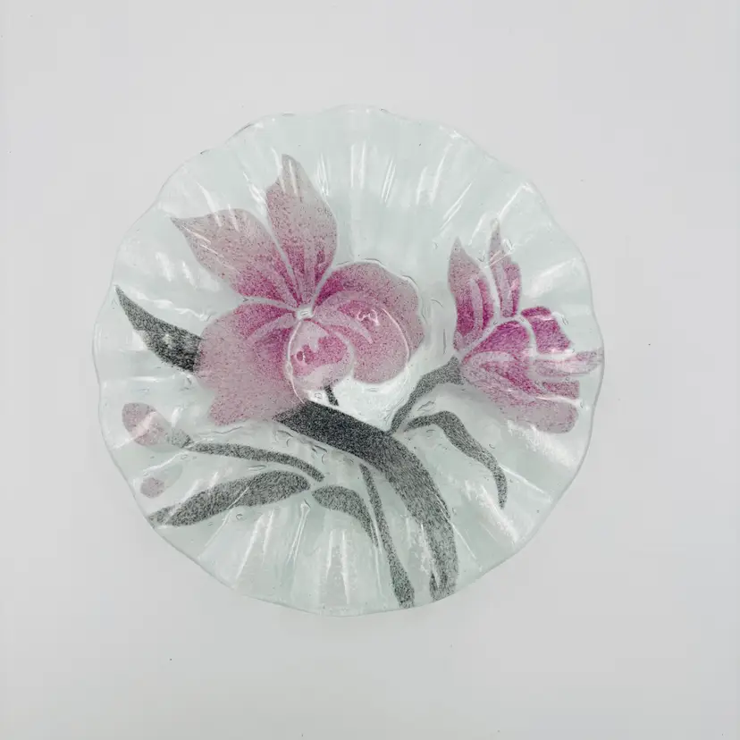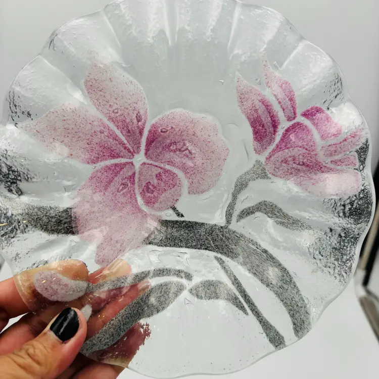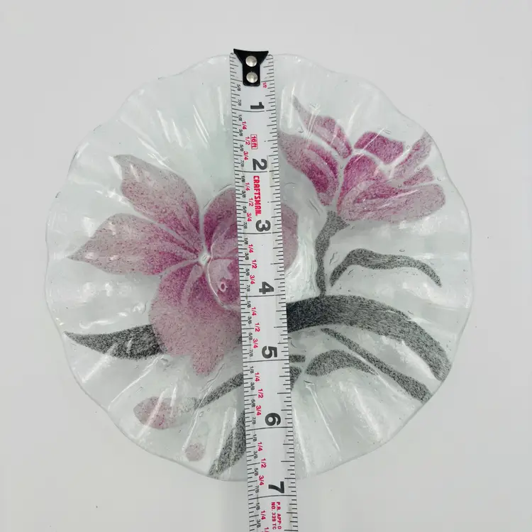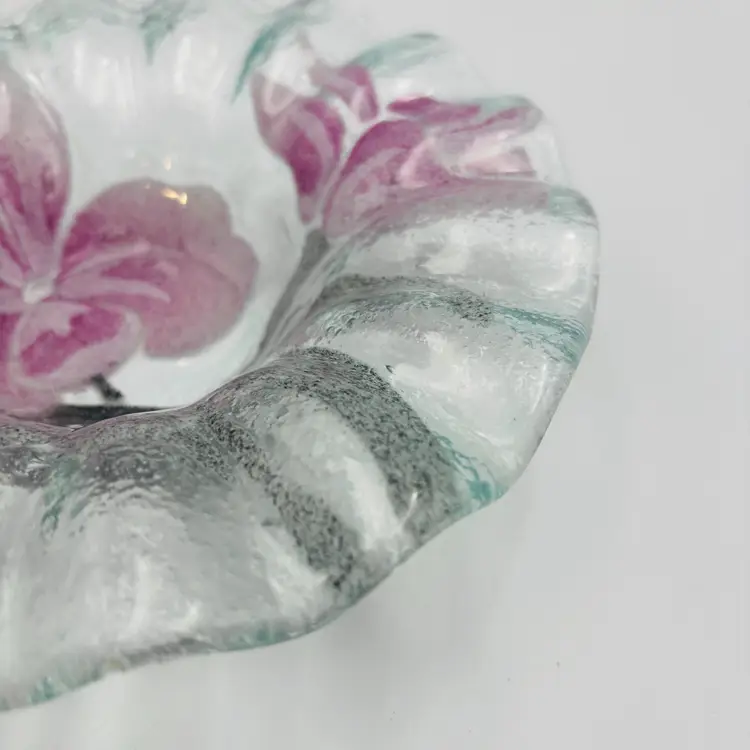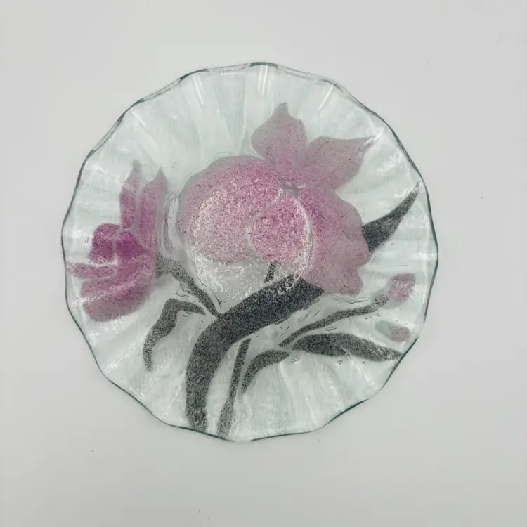 For sale is a Sydenstricker Fused Glass Ruffled Berry Bowl Floral Pink Iris