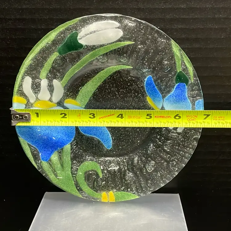 This is a Sydenstricker fused glass plate with a Japanese Iris (blue) floral design. Sydenstricker Glass has been producing fine quality fused glass in Cape Cod since 1968.