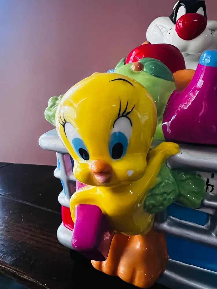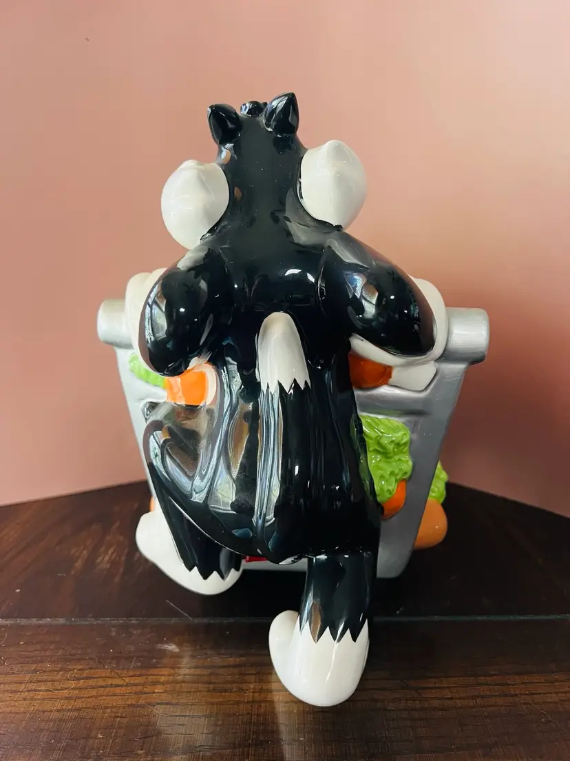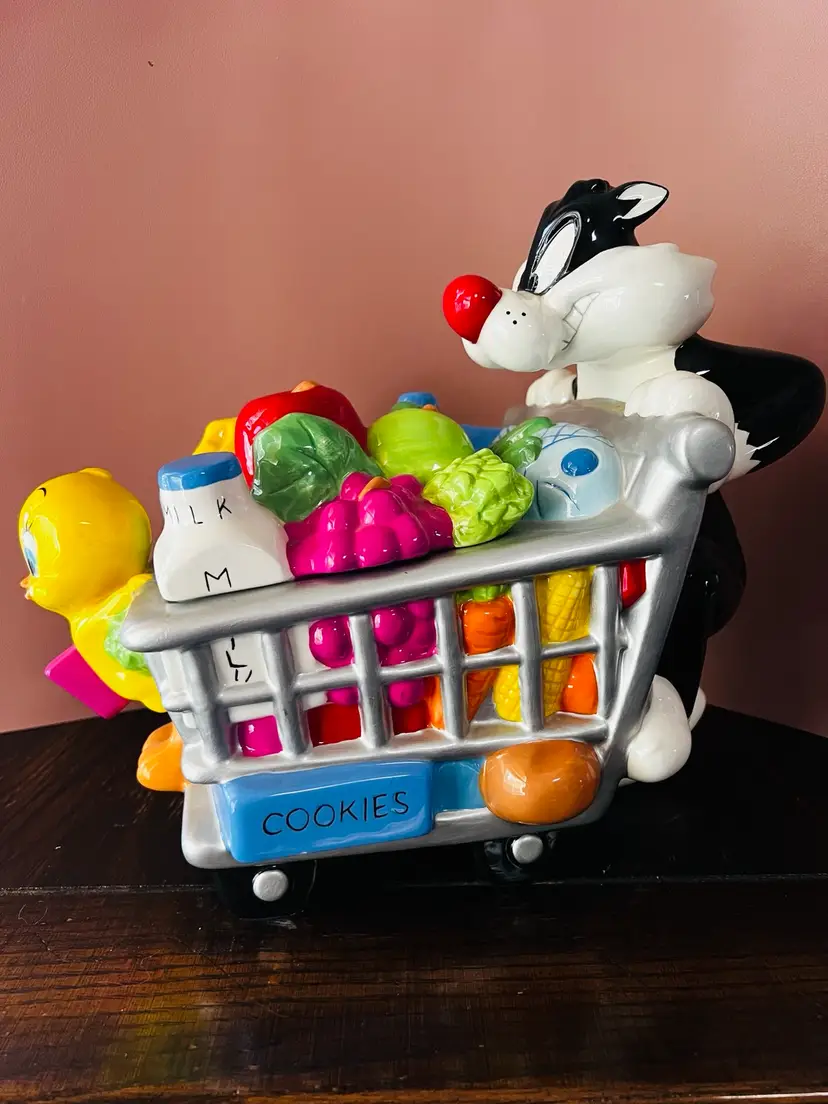 Warner brothers 1999 Sylvester and twenty bird shopping cart cookie jar. One small chip on tweety birds cheek (as shown in pictures)