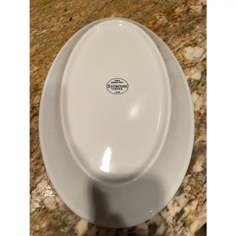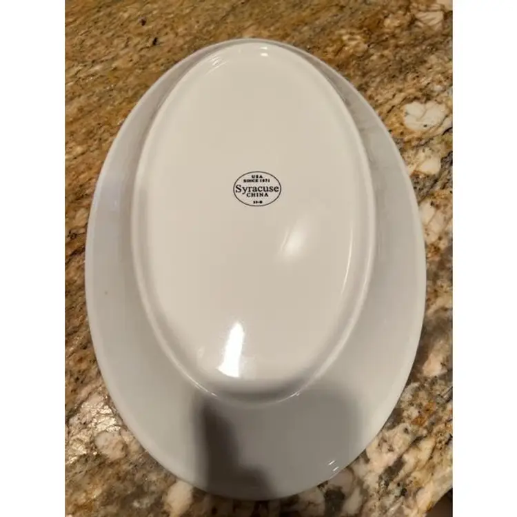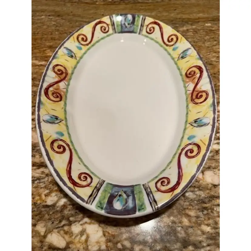 Hard to find Universal Cool pattern in an oval serving platter. Measures approximately 13” x 9” and is 1-3/4” tall. It has a white background with gray, green, blue and rust on yellow trim. I believe it is from the 2002 collection. Excellent condition – no chips, cracks or missing paint.