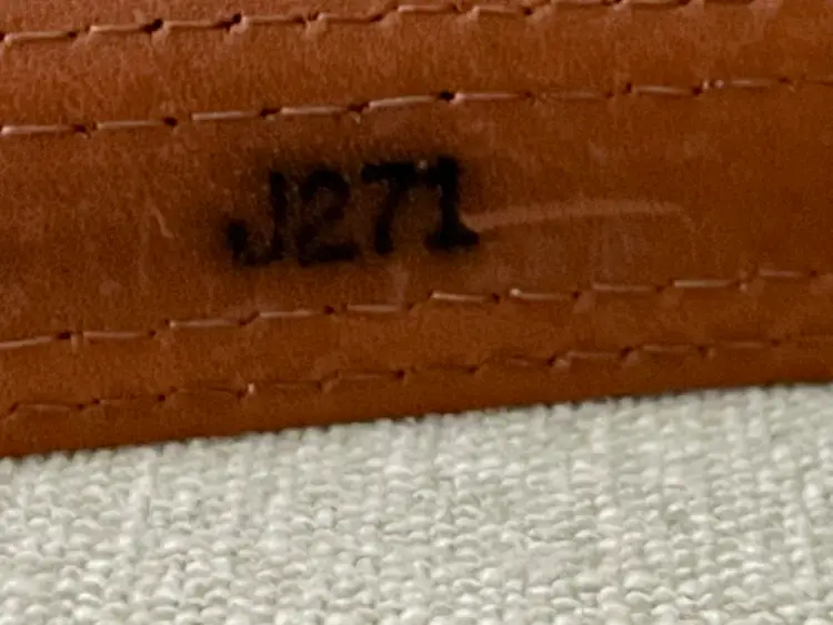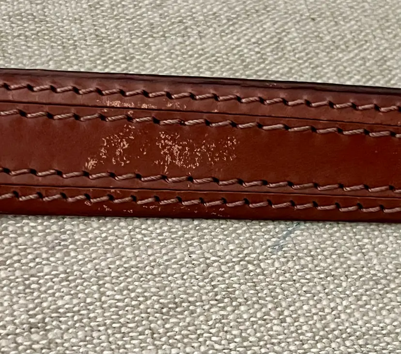 Please look at all the photos prior to deciding to make a purchase. As a pre-owned item, there are seldom perfections ~ this does show an area where the leather dye isn’t perfect - as seen in the photos. Buyer, however, is strongly encouraged to review the photos and decide for themselves its condition. Prior to a purchase, questions not answered in photos, details, description are welcome.