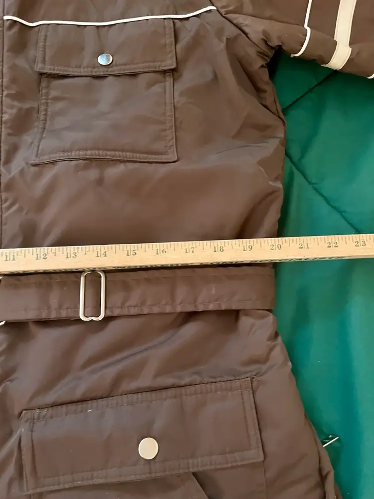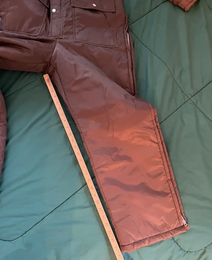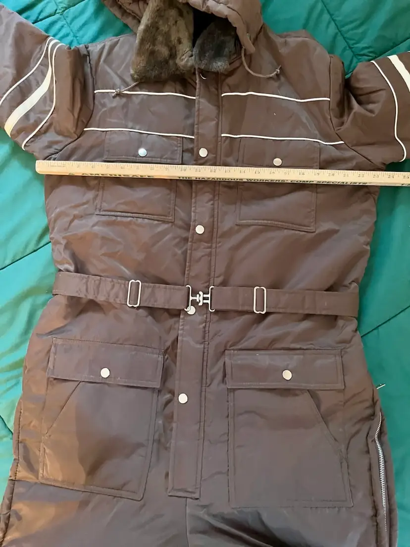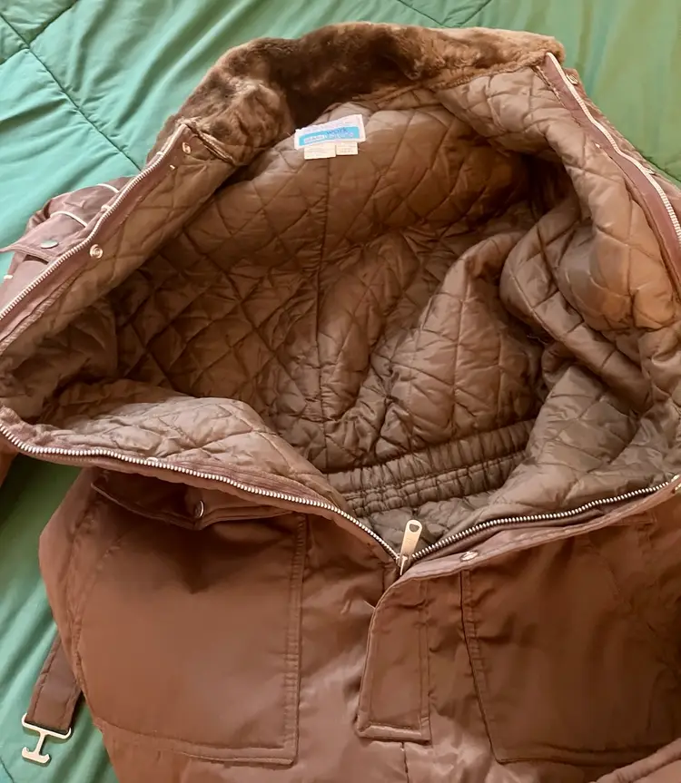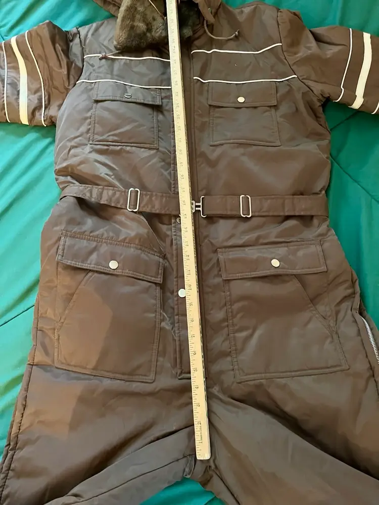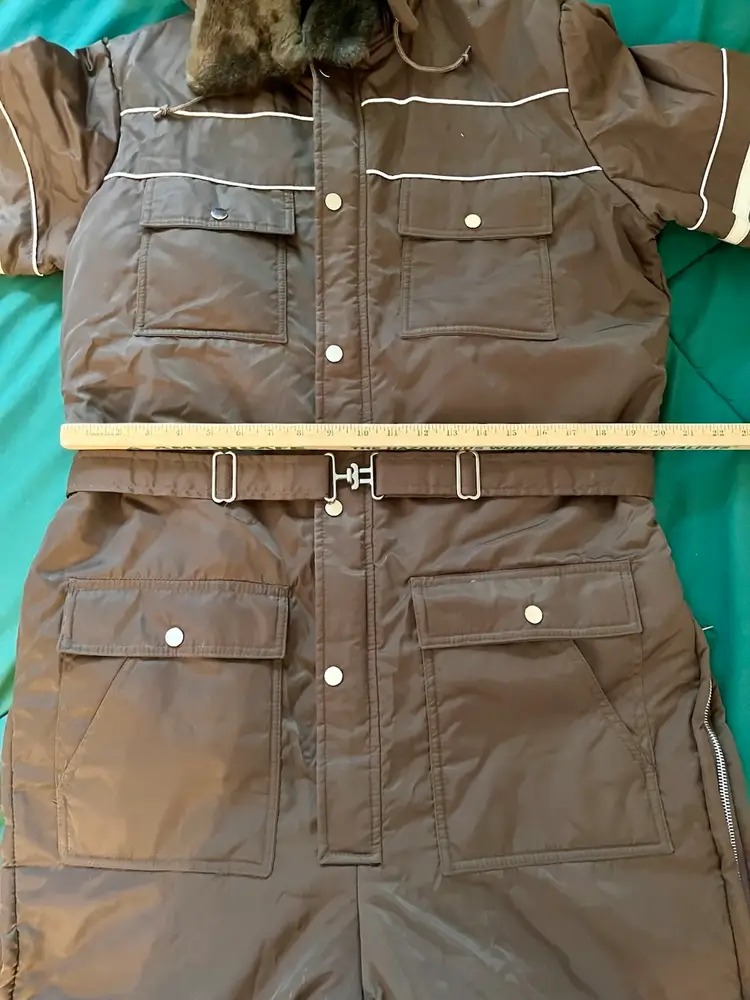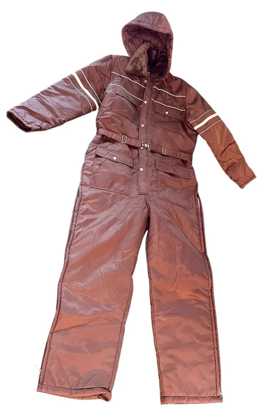 This vintage Sears snowsuit in sizes 42-44 features a 100% nylon outer shell with a quilted interior for added warmth. The suit includes reflective white stripes for visibility, side leg zippers for easy access, and a removable hood with a faux fur collar. With a retro 1970s style and themes of skiing, tobogganing, snowboarding, and outdoor activities, this snowsuit is perfect for winter enthusiasts looking for a retro-stylish and functional piece of clothing. The garment care instructions recommend machine washing, making it easy to keep clean and ready for the slopes, hills, or the track.