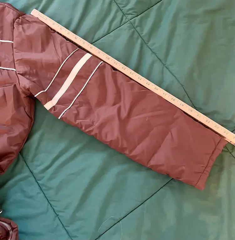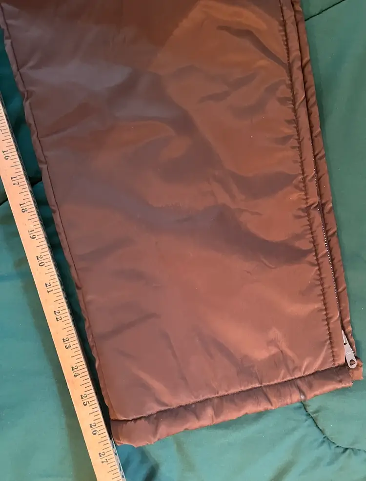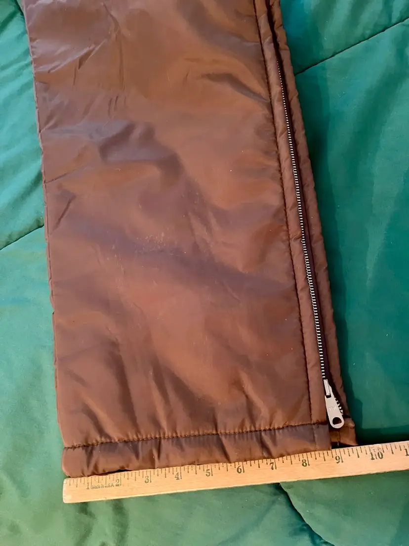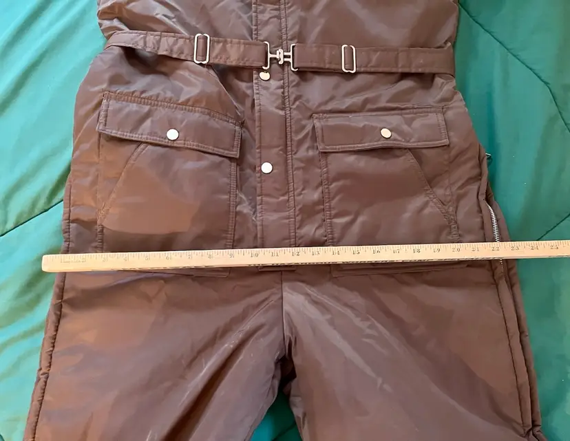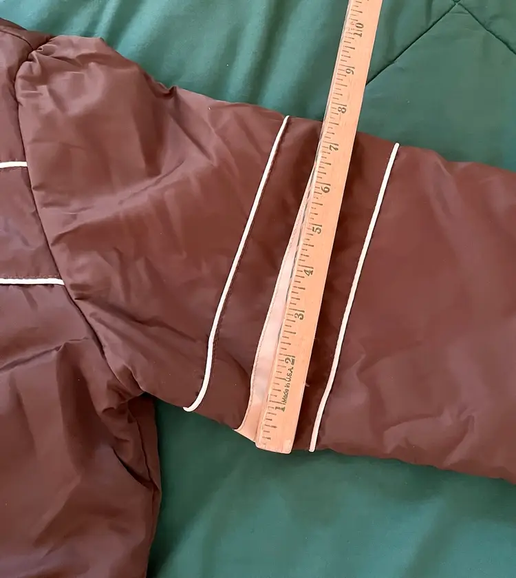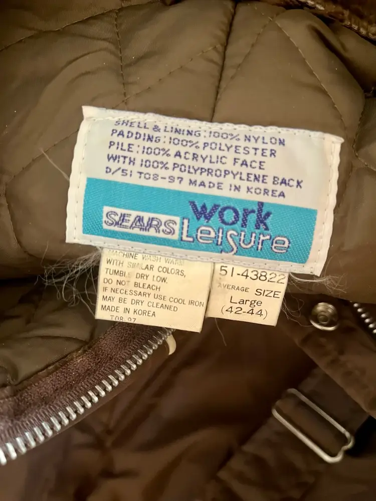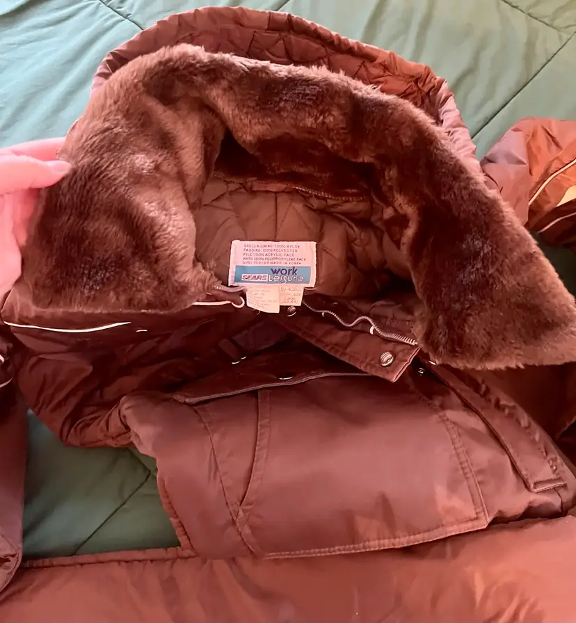 This vintage Sears snowsuit in sizes 42-44 features a 100% nylon outer shell with a quilted interior for added warmth. The suit includes reflective white stripes for visibility, side leg zippers for easy access, and a removable hood with a faux fur collar. With a retro 1970s style and themes of skiing, tobogganing, snowboarding, and outdoor activities, this snowsuit is perfect for winter enthusiasts looking for a retro-stylish and functional piece of clothing. The garment care instructions recommend machine washing, making it easy to keep clean and ready for the slopes, hills, or the track.