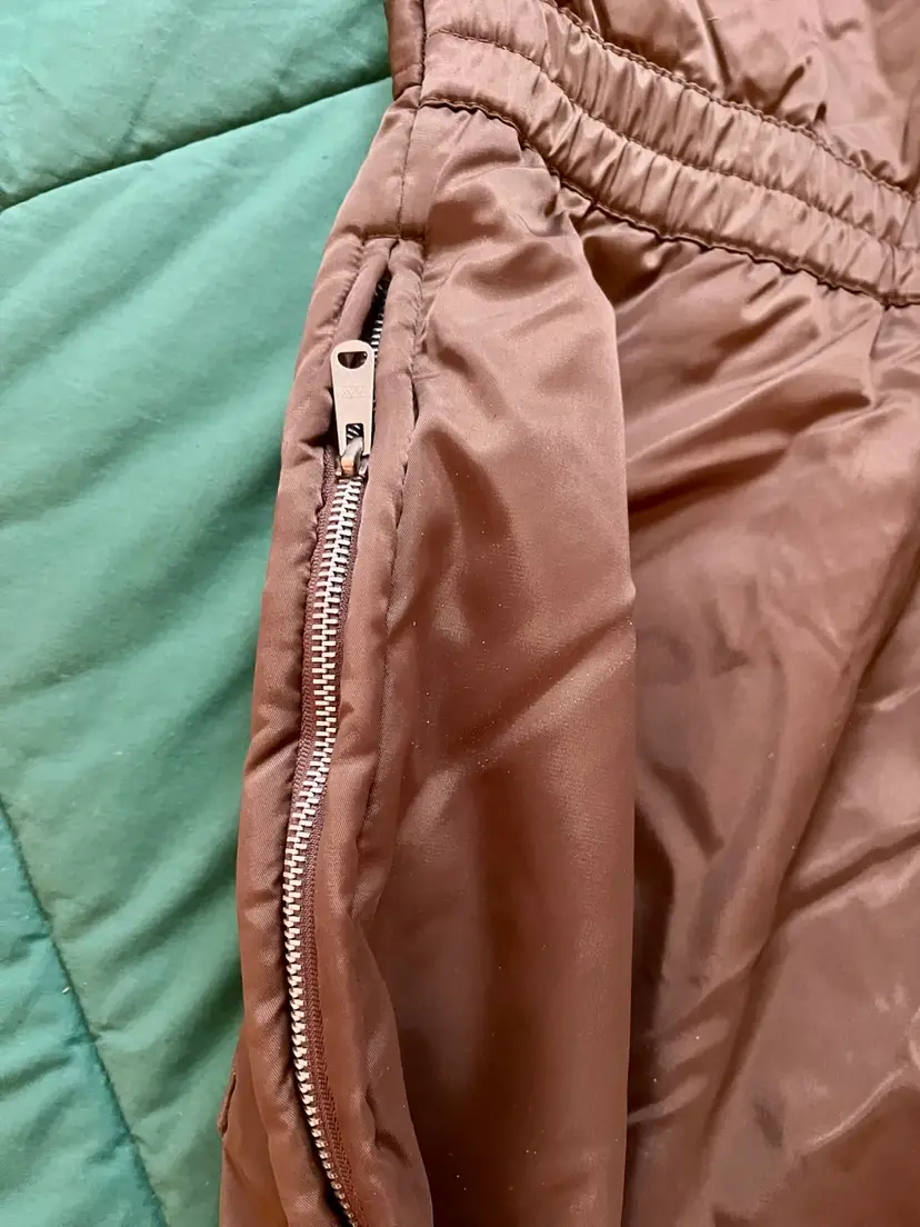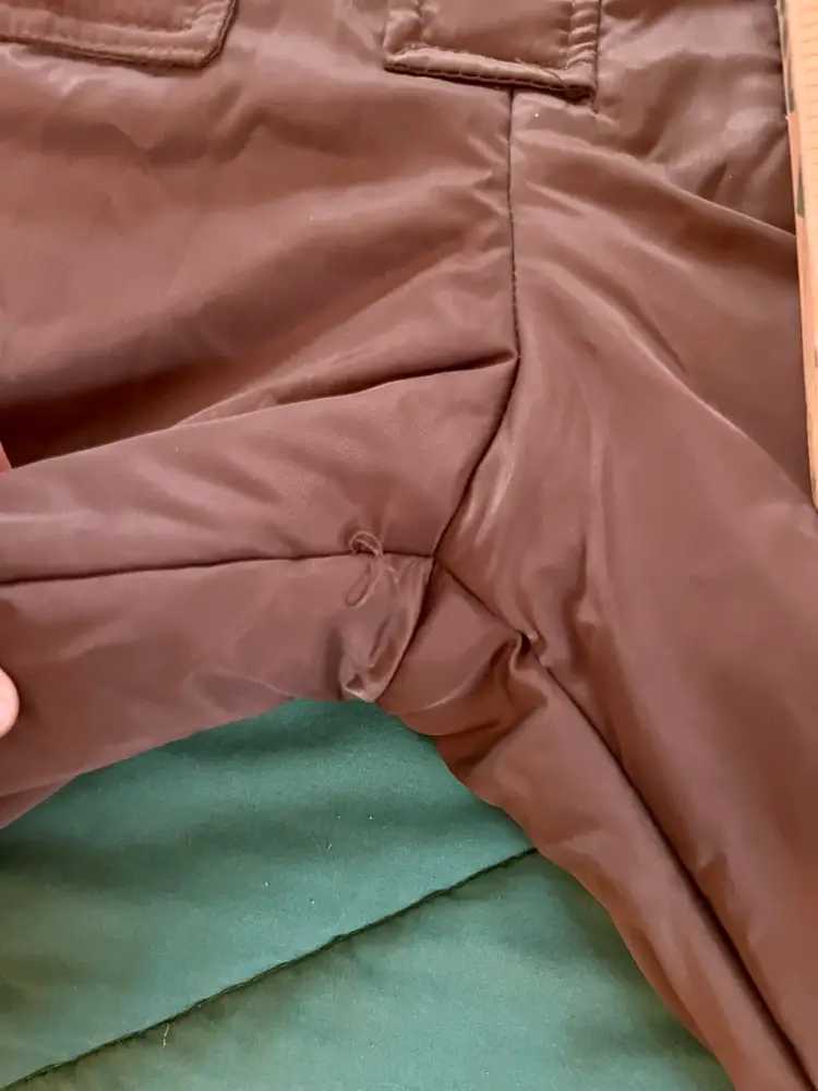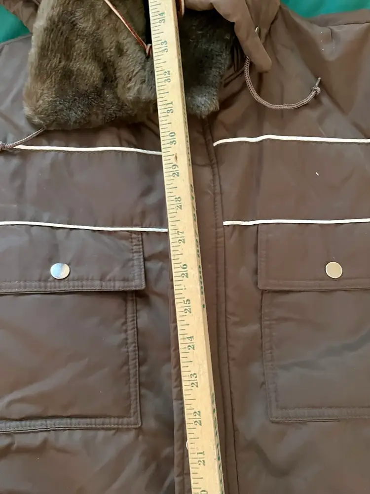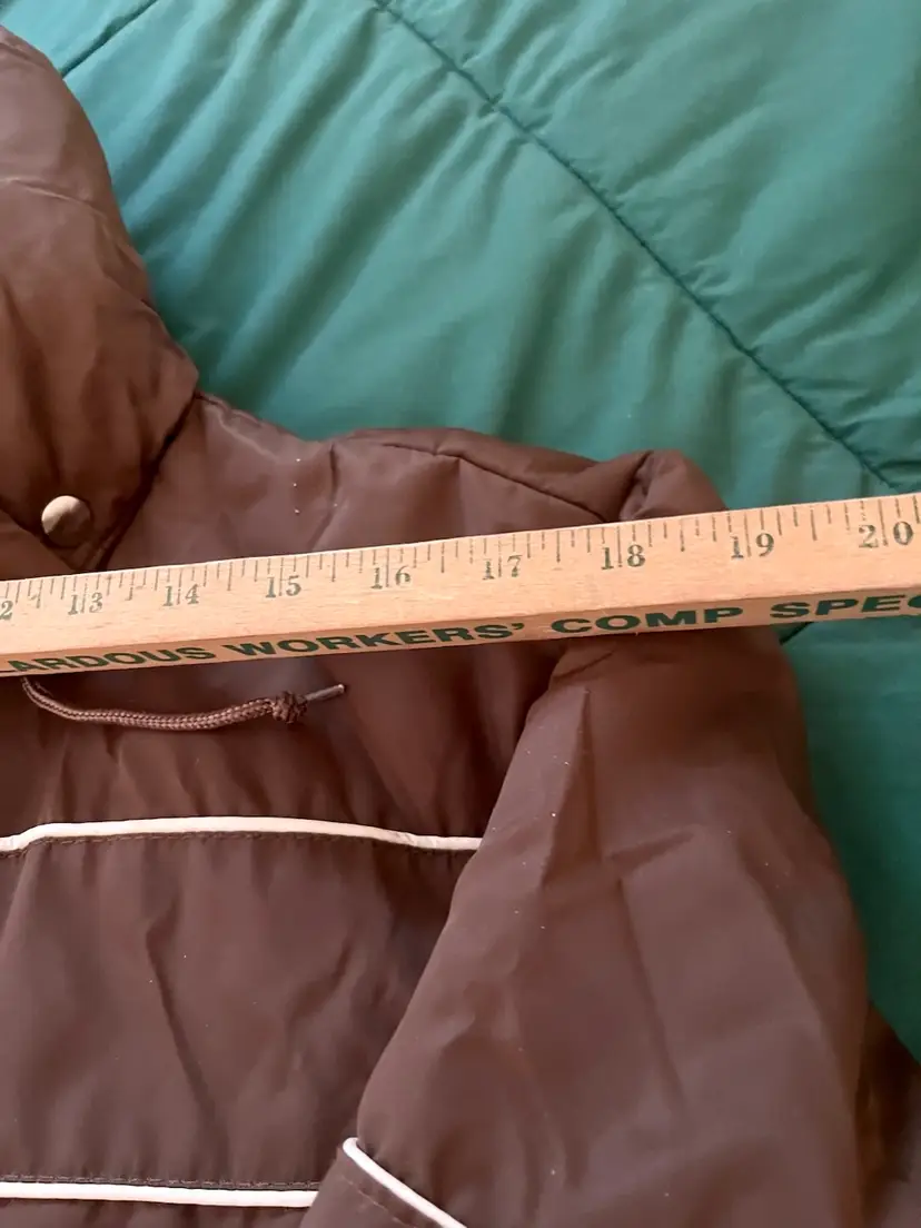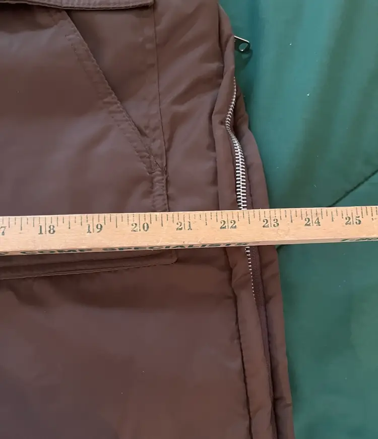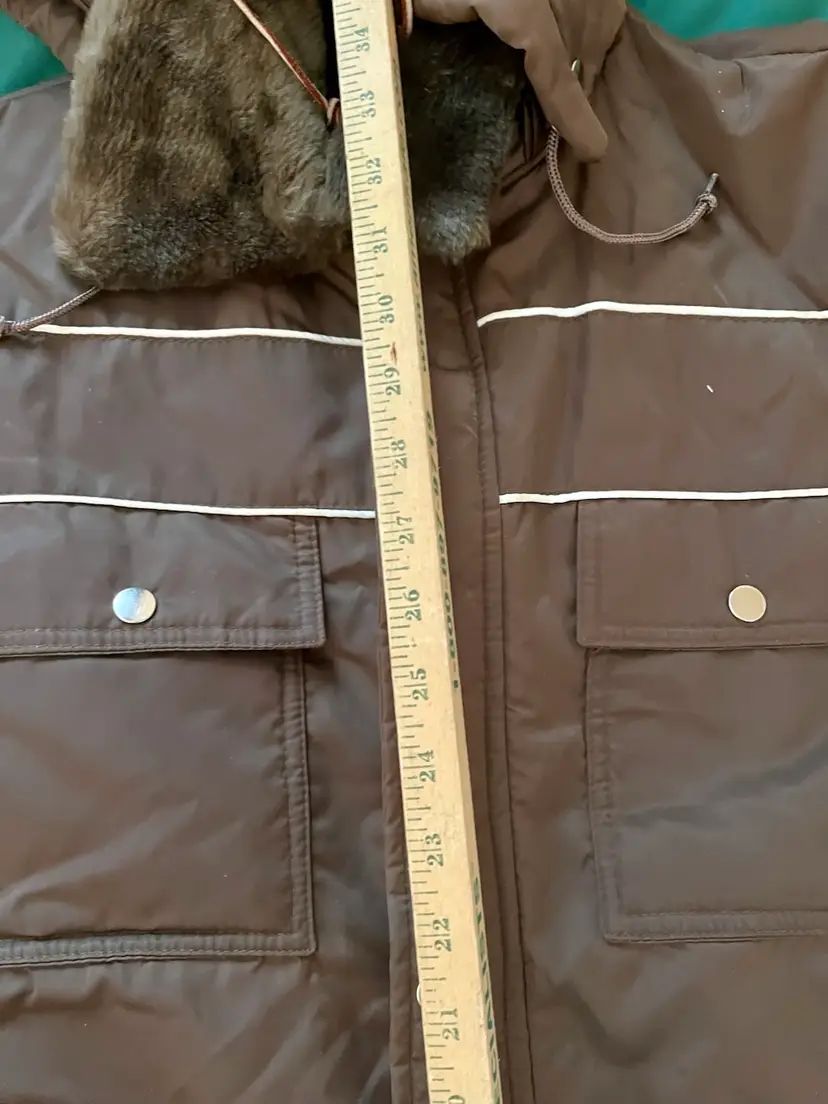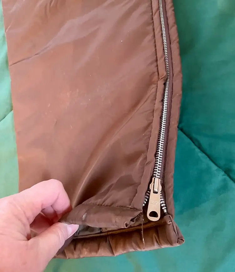 This vintage Sears snowsuit in sizes 42-44 features a 100% nylon outer shell with a quilted interior for added warmth. The suit includes reflective white stripes for visibility, side leg zippers for easy access, and a removable hood with a faux fur collar. With a retro 1970s style and themes of skiing, tobogganing, snowboarding, and outdoor activities, this snowsuit is perfect for winter enthusiasts looking for a retro-stylish and functional piece of clothing. The garment care instructions recommend machine washing, making it easy to keep clean and ready for the slopes, hills, or the track.