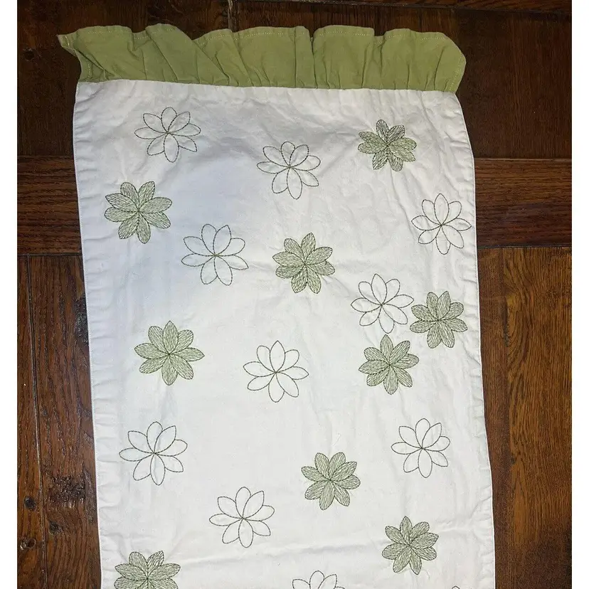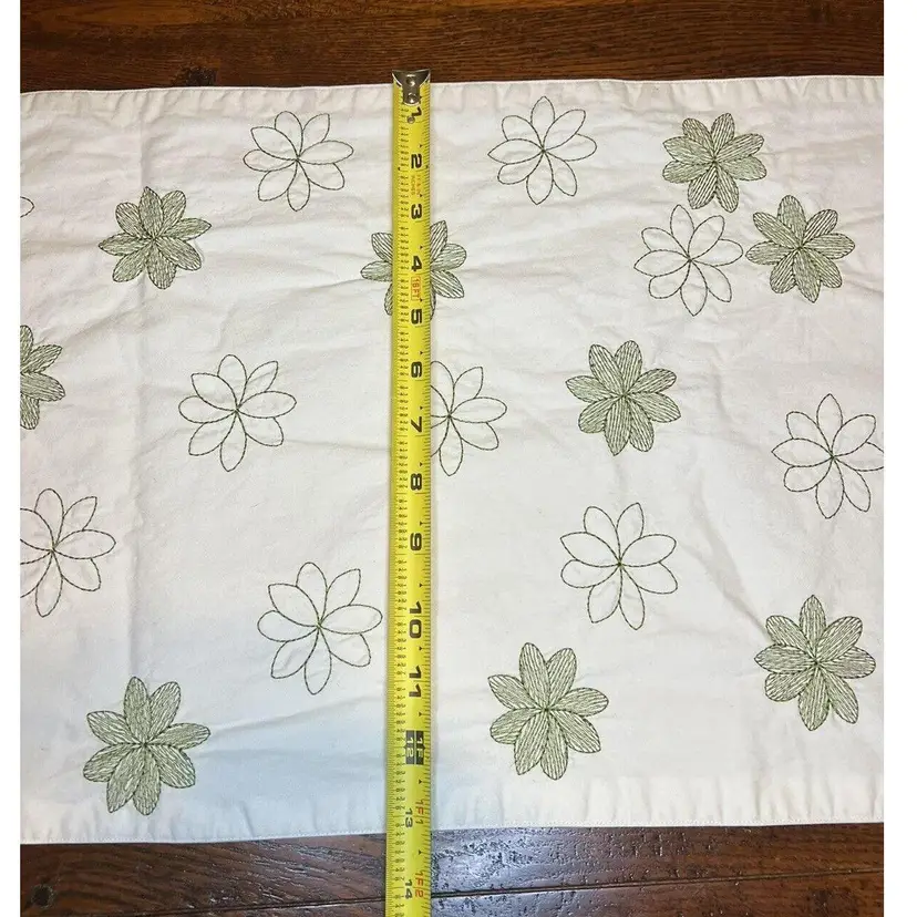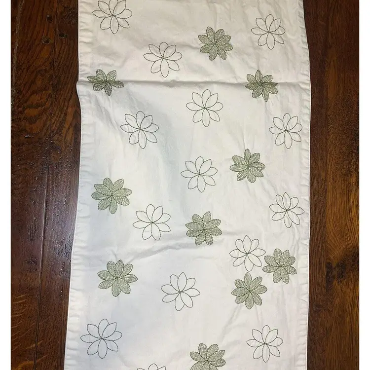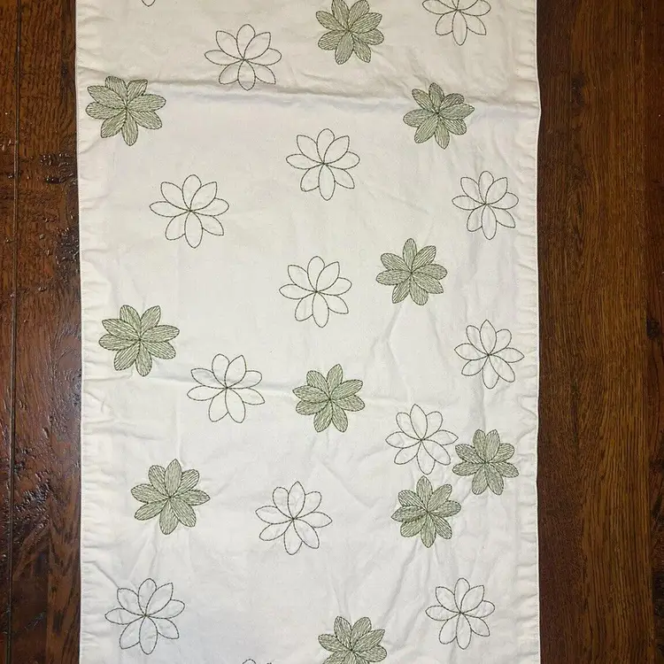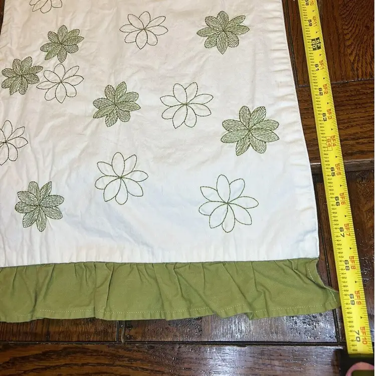 Add a touch of farmhouse charm to your dining table with this beautiful table runner. Measuring approximately 13 inches by 69 inches, this rectangular runner features a lovely floral pattern in of green, making it perfect for spring or St. Patrick's Day occasions. Made of soft cotton material with ruffled ends, this runner is both stylish and functional. Ideal for any home, this country-style table runner is a must-have for any kitchen, dining, or bar area. With its cream embroidered green flowers and ruffled edge, it will add a special touch to your dining experience.