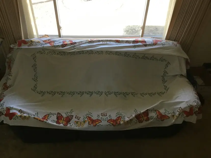 96 inches long by 60 inches wide, large tablecloth for spring, summer, fall, birthdays, Easter. Monarch and other butterflies around the edges, green-leaf vines between butterflies and around central rectangle of tablecloth. See photos.