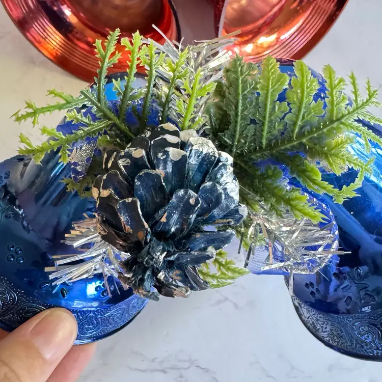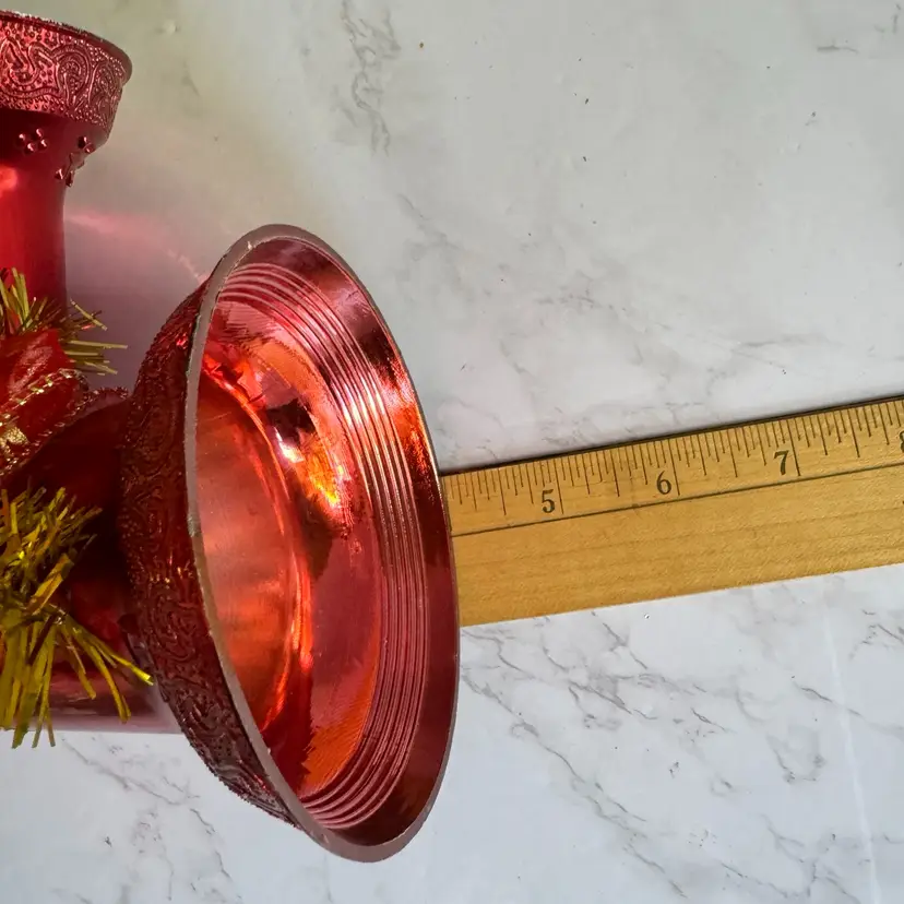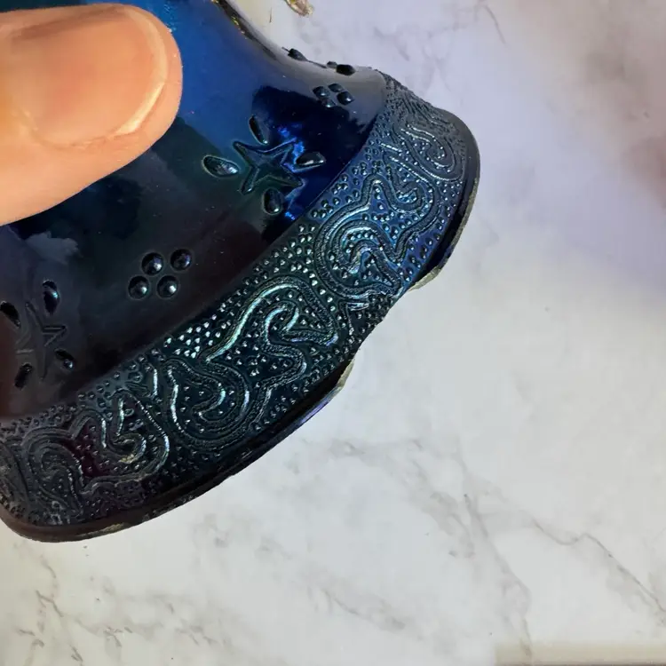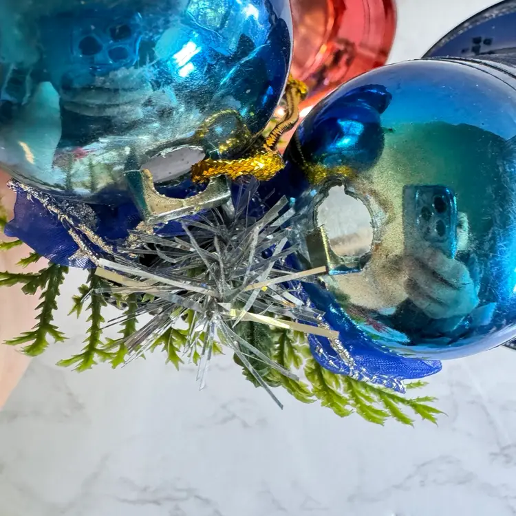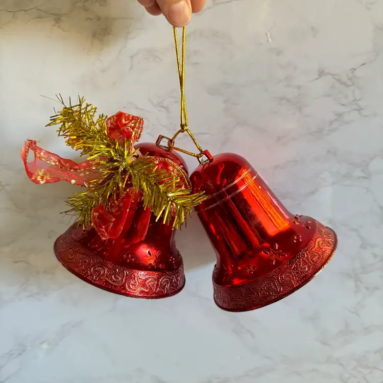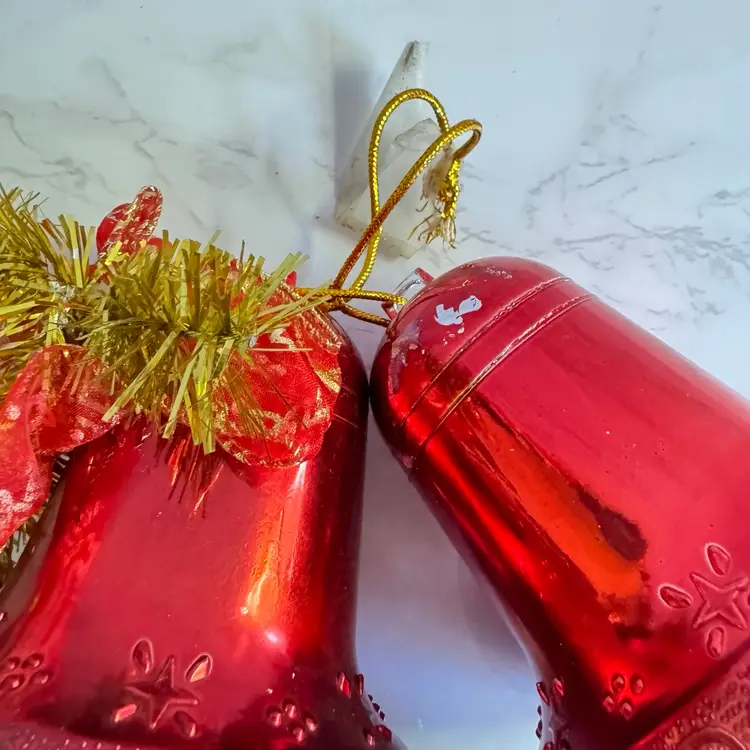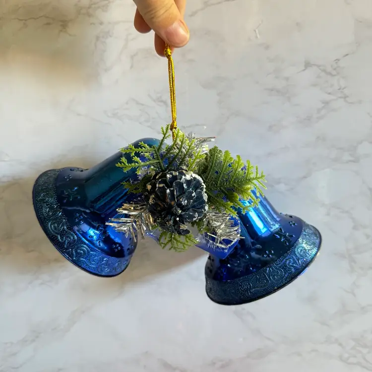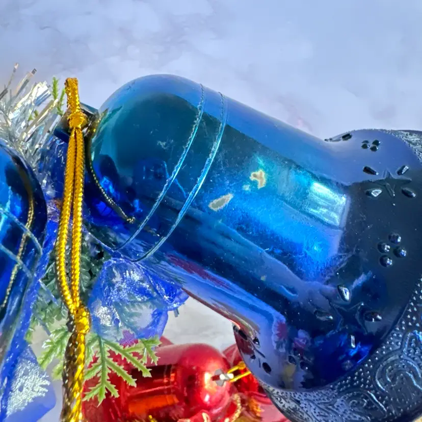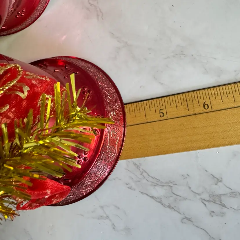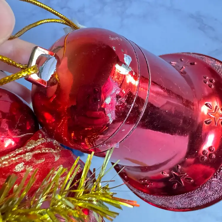 Fair vintage condition with areas of paint loss, chips to the plastic, missing decorative pieces, and one blue bell is missing the hanging piece on top. Each individual bell measures about 4”dia x 4”tall