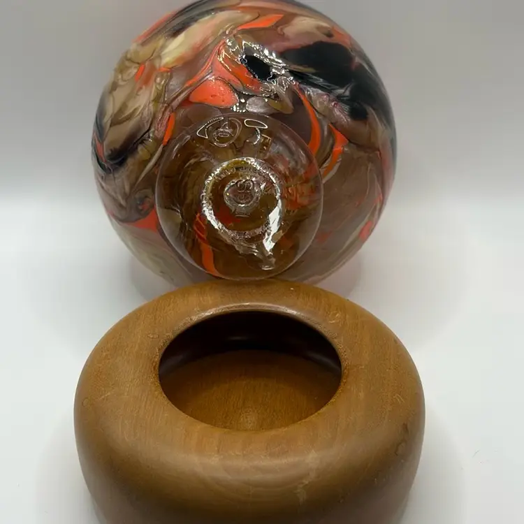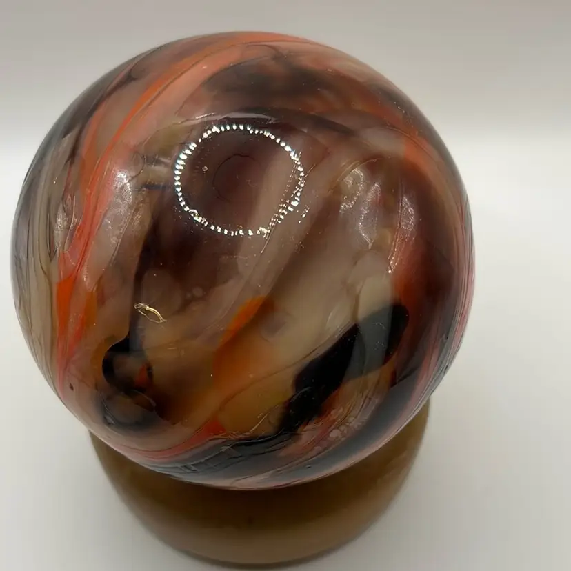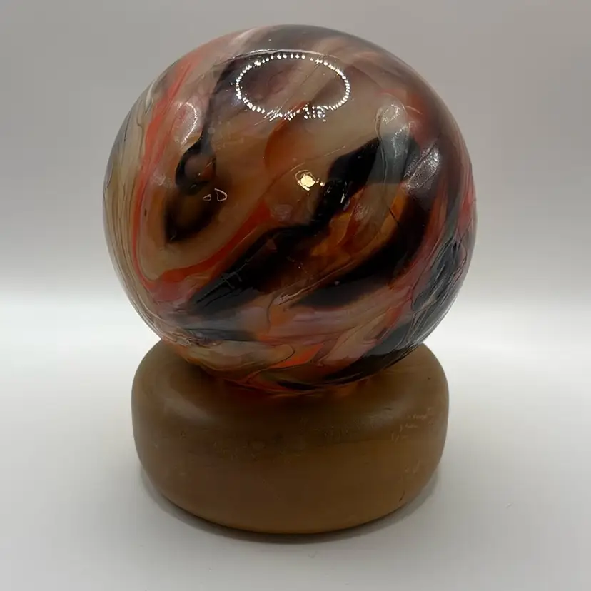 Tacoma Glass Studio Large 4 1/2” Round Paperweight In Swirling Browns, Oranges, Cream Glass. Comes With Custom Wooden Base
