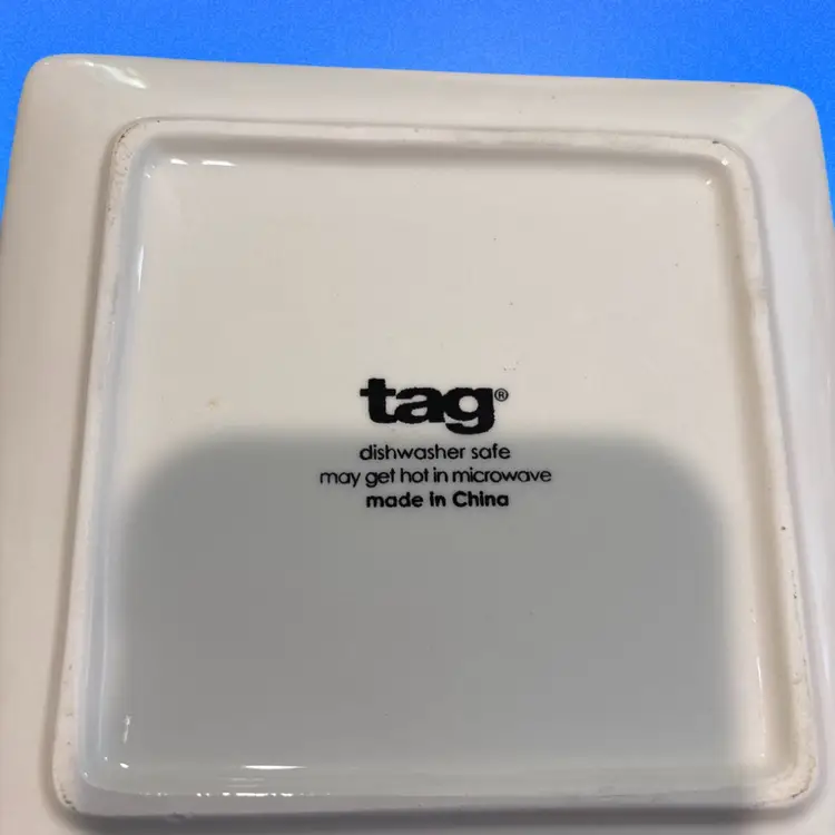 • Maker: Tag Ltd. • Pattern: Santa face (square design) • Dishwasher safe; microwave safe (may get hot) • Size: Approx.: 6” x 6” • Marked on bottom: tag® • Condition: Excellent, no chips or cracks, some light wear consistent with age