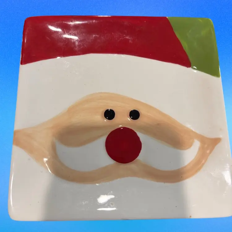 Add festive charm to your holiday table with this Santa face square plate from Tag Ltd. Featuring a whimsical hand-painted design with Santa’s rosy red nose, mustache, and hat, this plate is perfect for cookies, desserts, serving holiday treats or even a spoon rest.