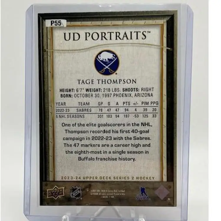 Tage Thompson 2023-2024 Upper Deck Hockey Series 2 UD Portraits Buffalo Sabres. Shipping is $1 for the first card, +$0.50 for additional cards, and ships PWE within 1-2 days.