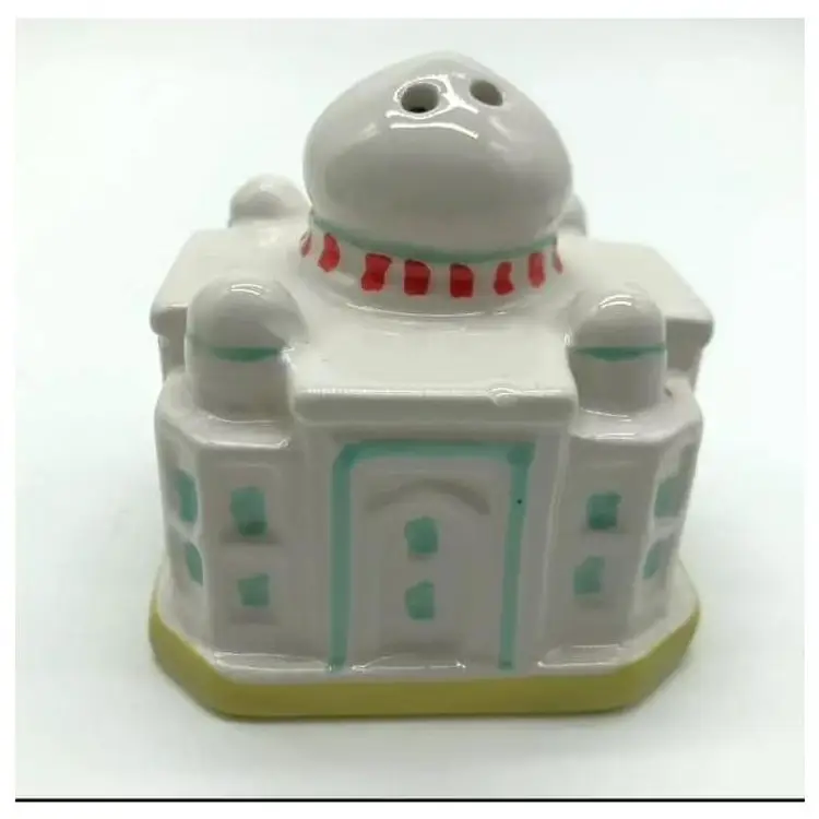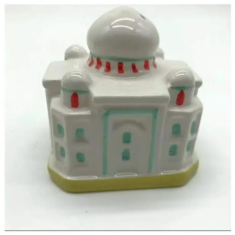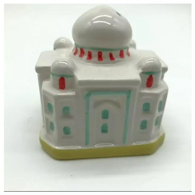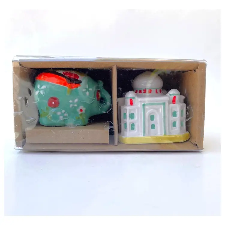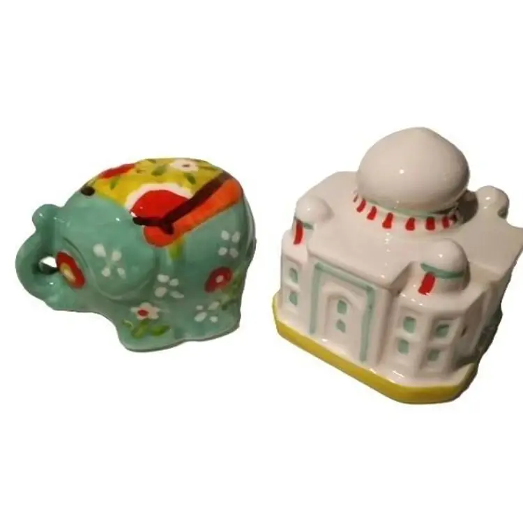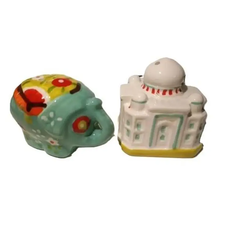 Very cute and collectible porcelain salt and pepper shakers in the form of the Taj Mahal and Indian Elephant. New in original box. Taj Mahal: 2" tall Elephant: 1.75" tall